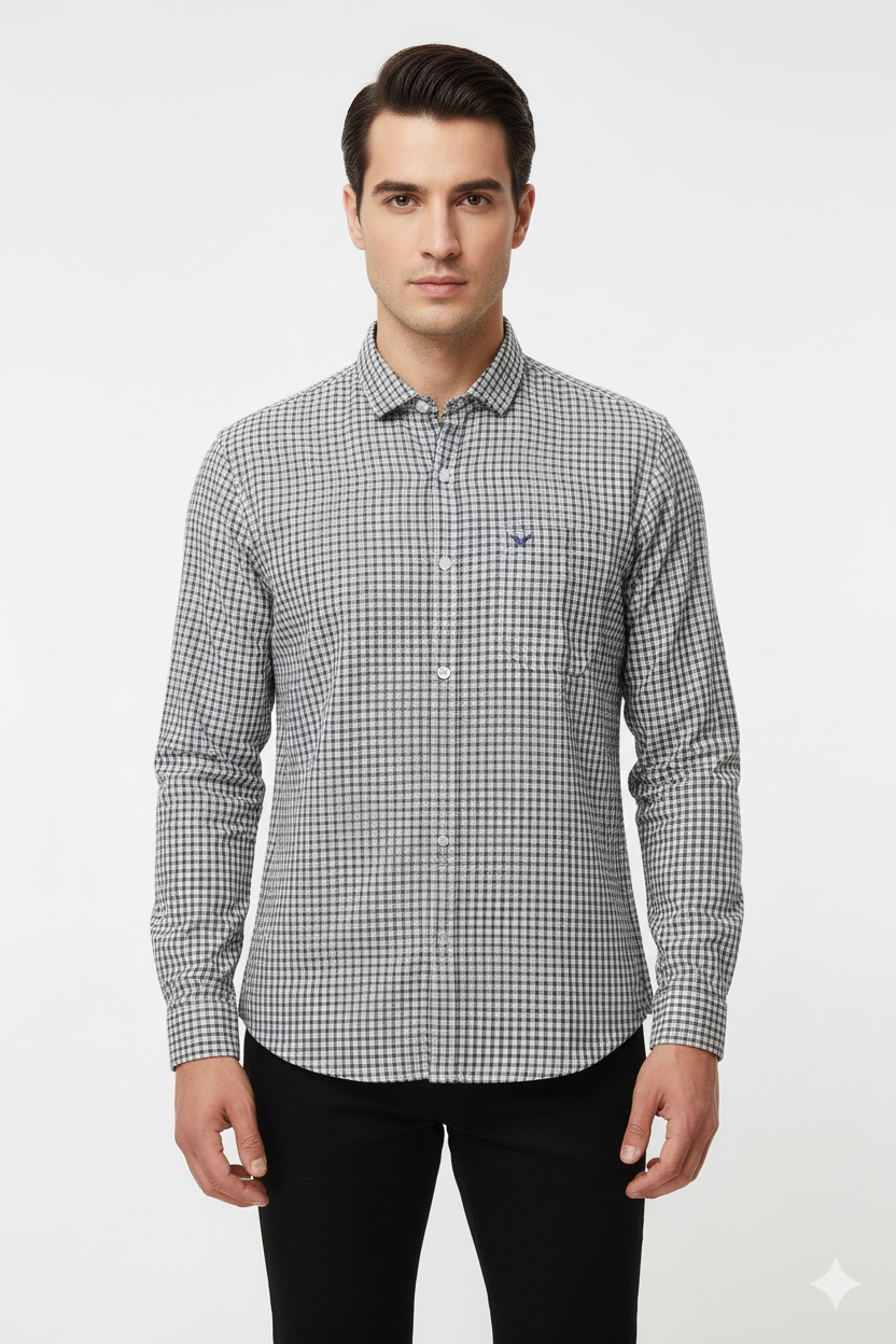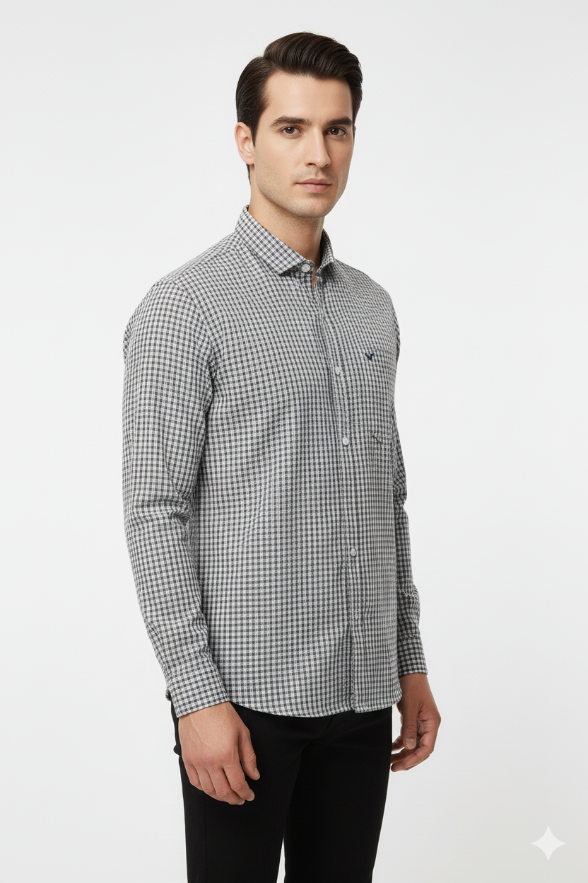 A refined grey checkered shirt for men, designed with a timeless micro-check pattern and a sleek slim fit. Ideal for office, casual outings, or smart everyday wear.