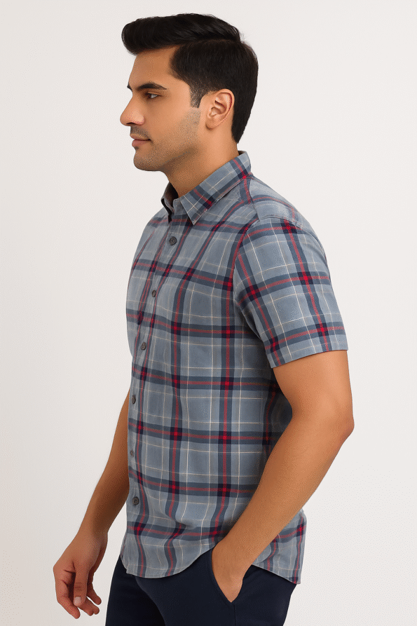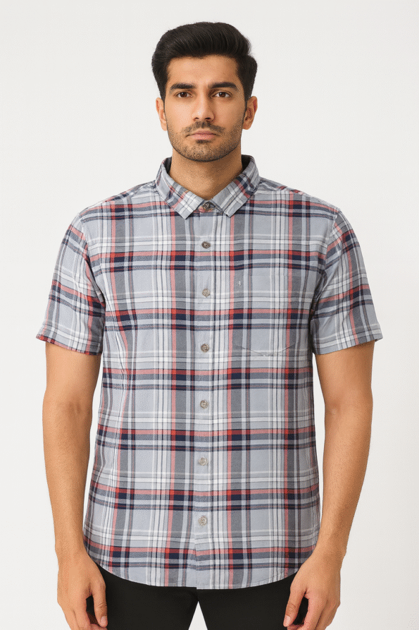 Add a contemporary touch to your casual wardrobe with this Men’s Grey & Red Checkered Casual Cotton Short Sleeve Shirt. Featuring a refined check pattern in shades of grey, red, and navy blue, this shirt strikes the perfect balance between classic and trendy. Made from premium-quality cotton fabric, it ensures all-day comfort and breathability. The shirt includes a button-down front, short sleeves, and a chest pocket, offering both functionality and timeless style. Ideal for casual outings, office Fridays, or weekend get-togethers — pair it with jeans or chinos for an effortlessly cool look.