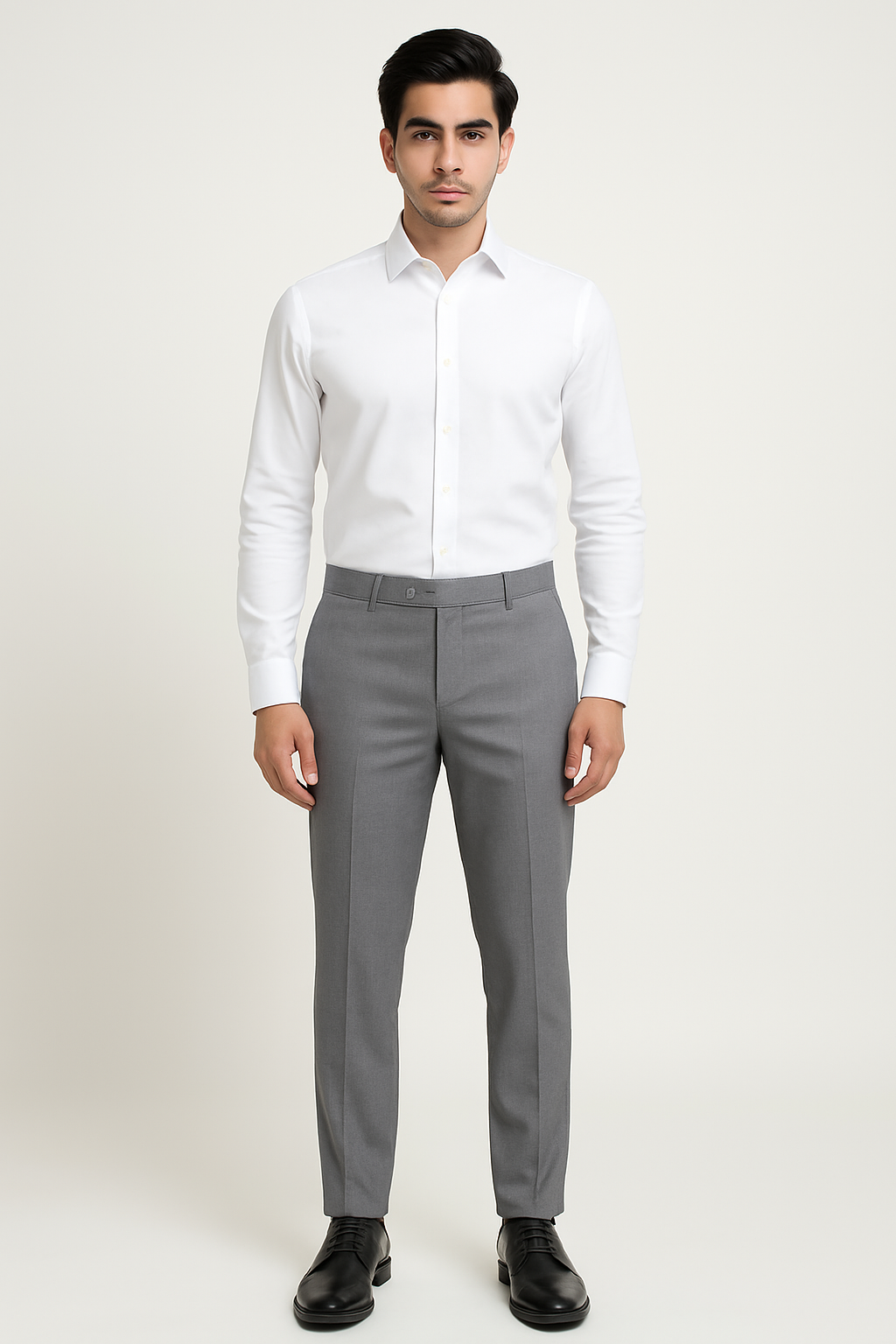 Upgrade your wardrobe with these slim-fit grey formal trousers, designed for timeless style and modern comfort. Featuring a flat front, mid-rise waist, and sharp crease lines, these trousers offer a clean, structured look perfect for professional and formal occasions. Crafted from a premium fabric blend, they provide a smooth finish with breathable comfort, allowing ease of movement throughout the day. The versatile grey shade pairs effortlessly with crisp shirts, blazers, and formal shoes for a sharp office-ready look.