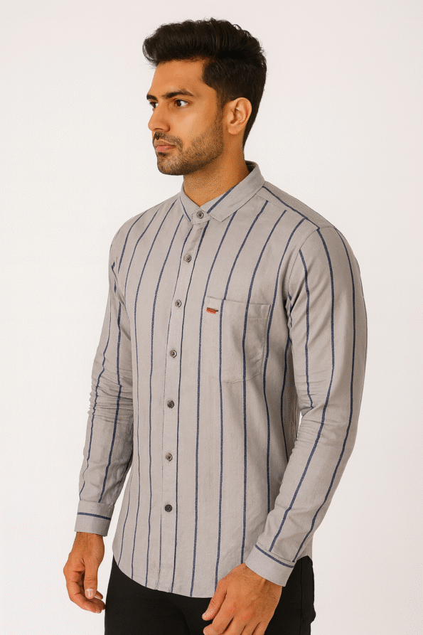 Step up your style with this sleek grey shirt featuring bold navy vertical stripes. Made from high-quality cotton blend fabric, it ensures all-day comfort and a polished look. The full sleeves, classic collar, and button-down design make it versatile enough for office wear, casual outings, or weekend gatherings. The single chest pocket adds a functional detail without compromising on style. Pair it with black trousers for a formal look or with jeans for a laid-back vibe.