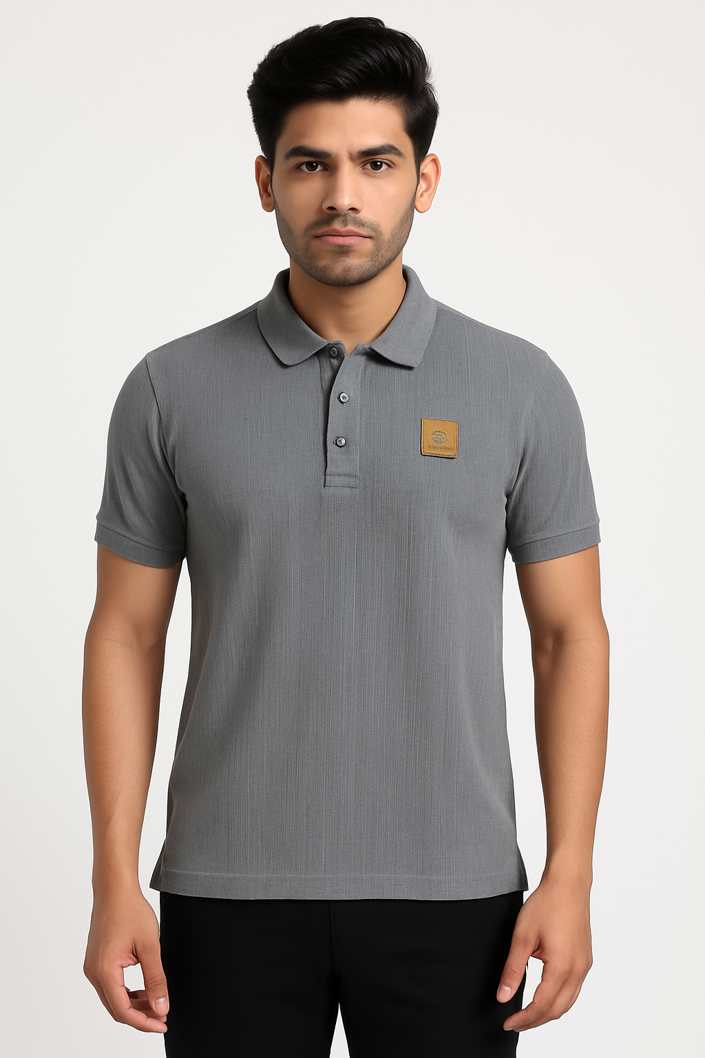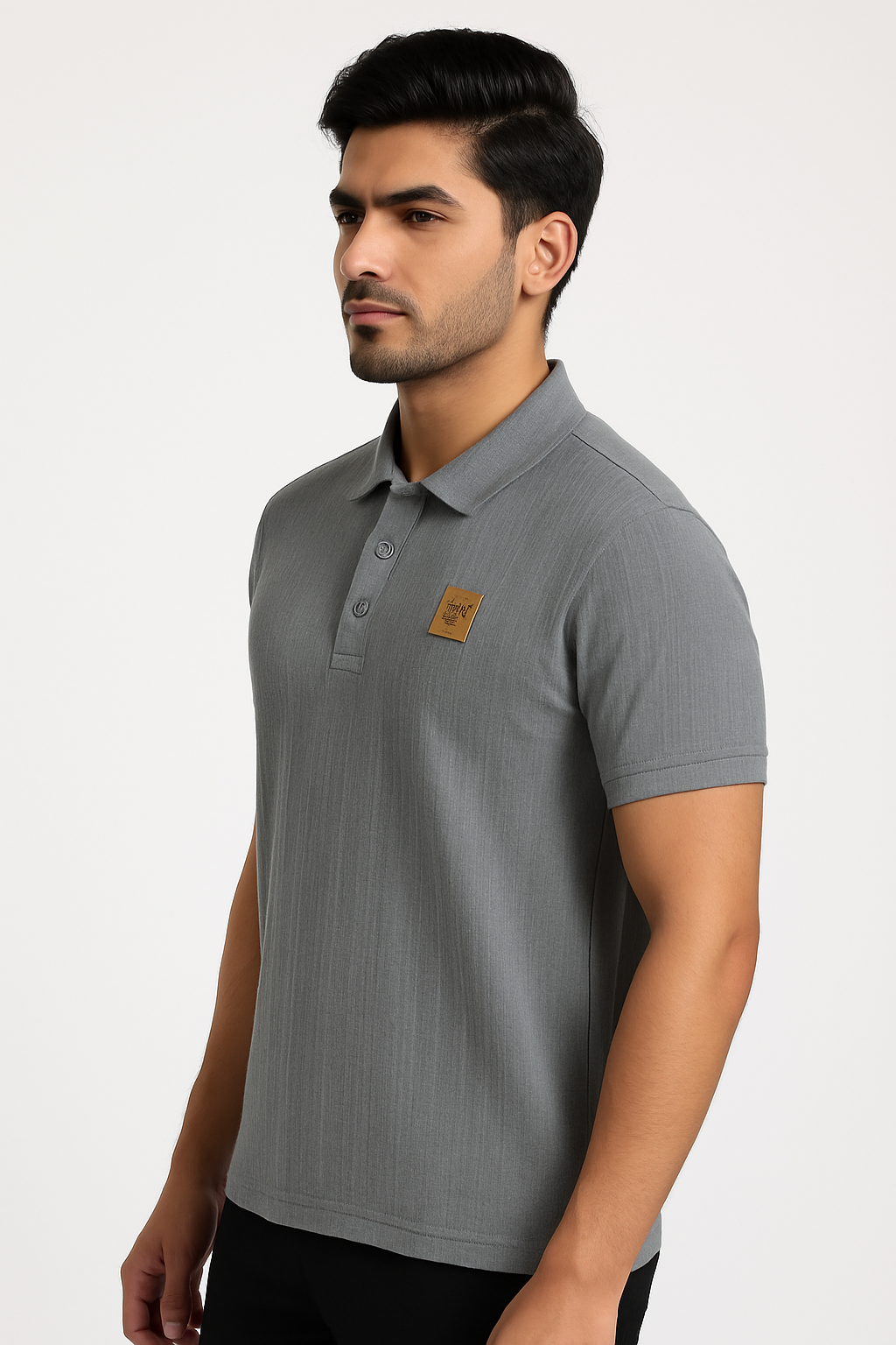 Stay stylish and comfortable with this olive green polo t-shirt featuring a ribbed texture and a unique chest patch design. Perfect for casual outings or semi-formal occasions.