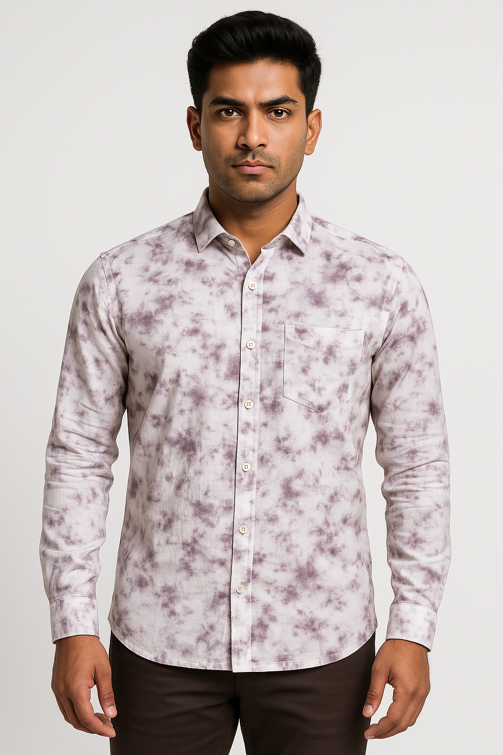 Stylish men’s cotton shirt with a soft lavender tie-dye print. Lightweight, breathable, and perfect for smart-casual and weekend wear.