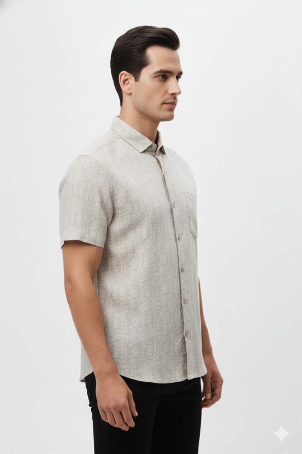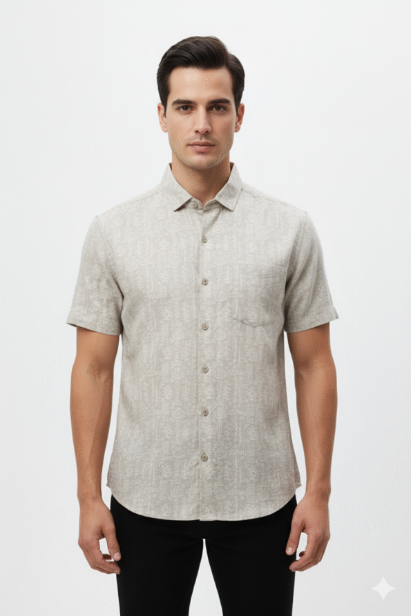 Tags: breathable fabric, casual style, Casual Wear, everyday wear, fashion tips, light beige shirt, lightweight shirt, men's clothing, men's fashion, men's wardrobe essentials, mens casual shirt, relaxed fit shirt, shirt styling, smart casual, stylish shirts, subtle pattern shirt, summer outfit, trendy menswear, versatile shirt
