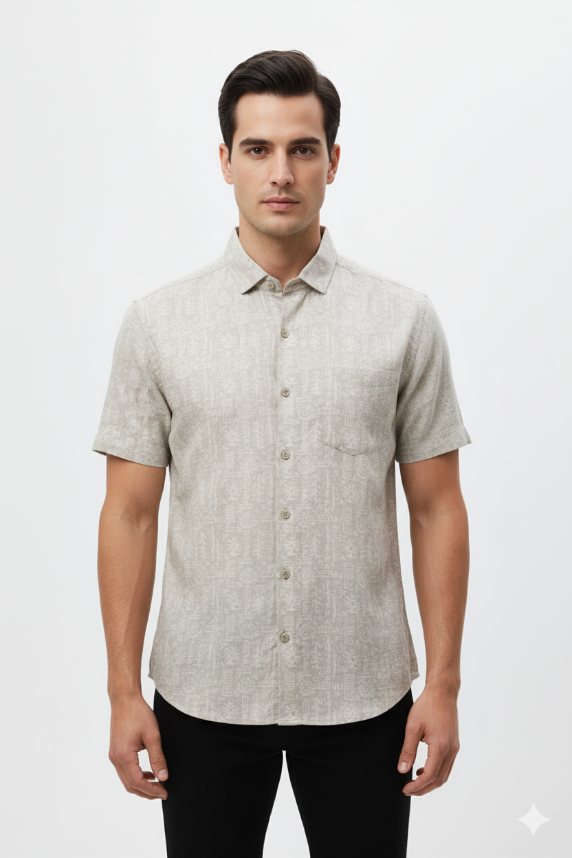This men’s light beige casual shirt offers understated sophistication with its soft tone and subtle woven pattern. Crafted from lightweight, breathable fabric, it ensures comfort while maintaining a polished appearance. The shirt features a button-down front, a classic collar, and a neatly tailored fit that complements any physique. Its versatile design makes it ideal for both smart-casual and semi-formal occasions—pair it with chinos, jeans, or dress trousers for an effortlessly stylish ensemble.