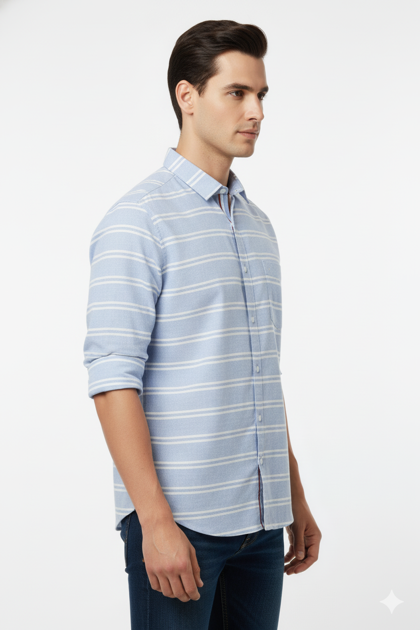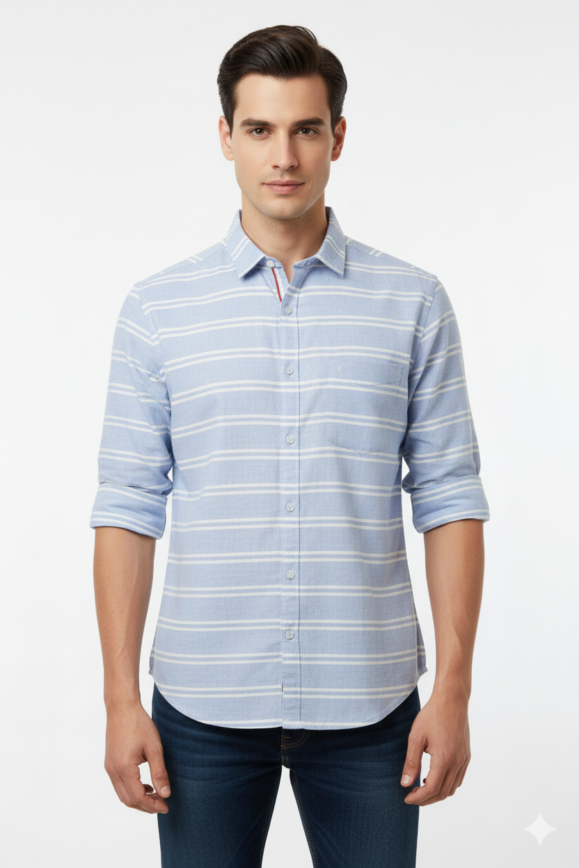 A casual light blue cotton shirt with white horizontal stripes, full sleeves, button-down closure, and a chest pocket. Perfect for relaxed outings and smart-casual wear.