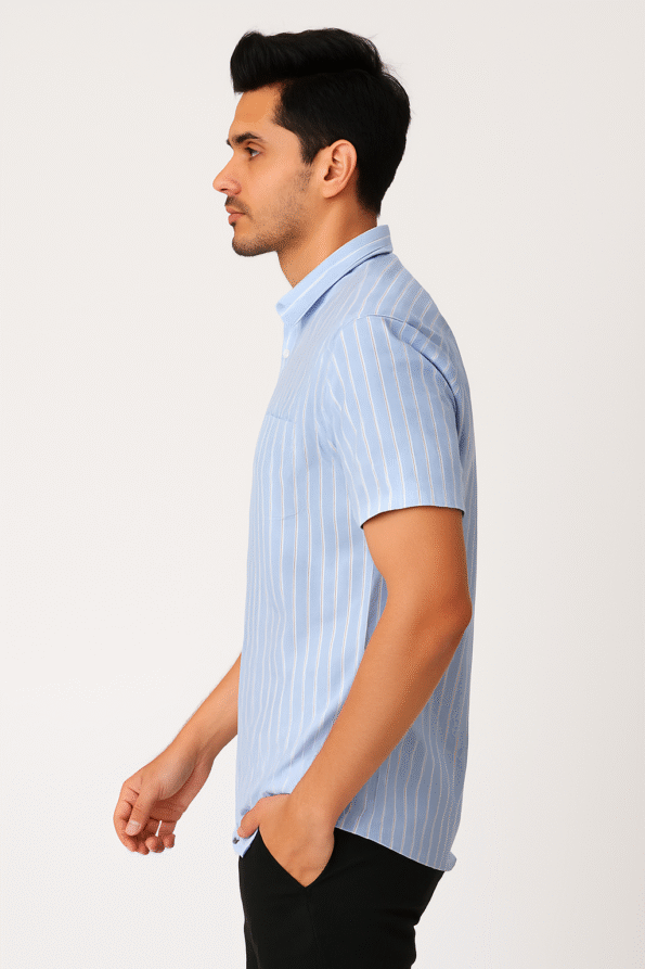 A classic light blue short-sleeve shirt with vertical white stripes, featuring a button-up front, chest pocket, and a tailored fit for casual and semi-formal occasions.