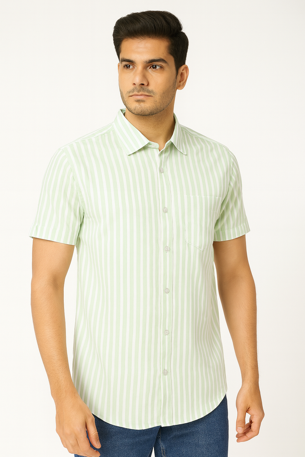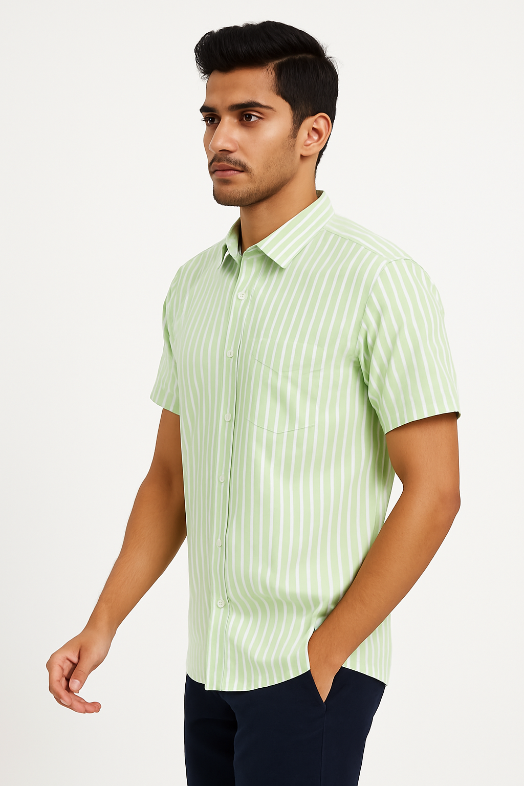 A fresh light green short-sleeve shirt with vertical white stripes, featuring a button-up closure and chest pocket—perfect for casual and semi-formal dressing.