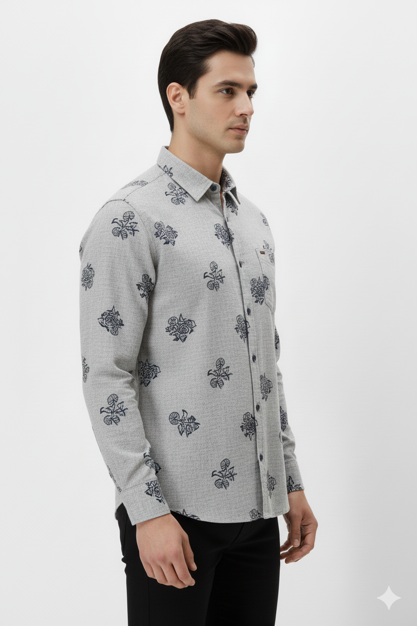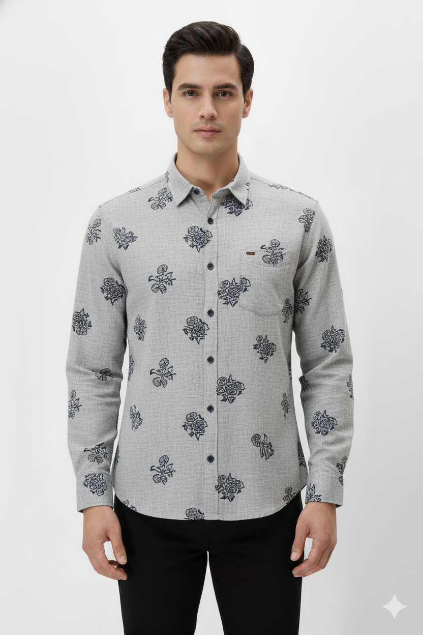 A stylish light grey slim-fit shirt featuring bold navy floral prints, full sleeves, and a classic collar—ideal for casual outings, evening wear, and smart weekend style.