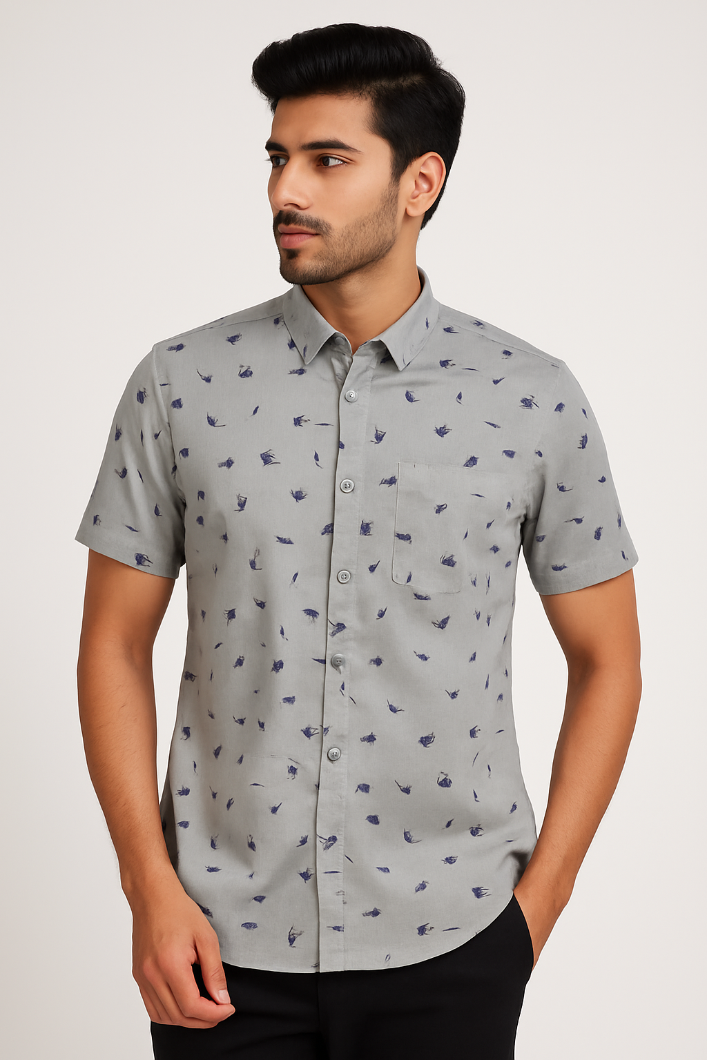 Redefine your casual style with this Men’s Light Grey Printed Casual Short Sleeve Shirt, designed for men who value comfort with a touch of sophistication. The shirt showcases a soft light grey base adorned with delicate navy abstract prints, adding a unique and modern flair. Made from lightweight, breathable cotton fabric, it ensures comfort throughout the day. The shirt features a button-down front, classic collar, and a neatly placed chest pocket — making it perfect for casual outings, work Fridays, or weekend brunches. Pair it with dark jeans or chinos for a sleek, versatile look.