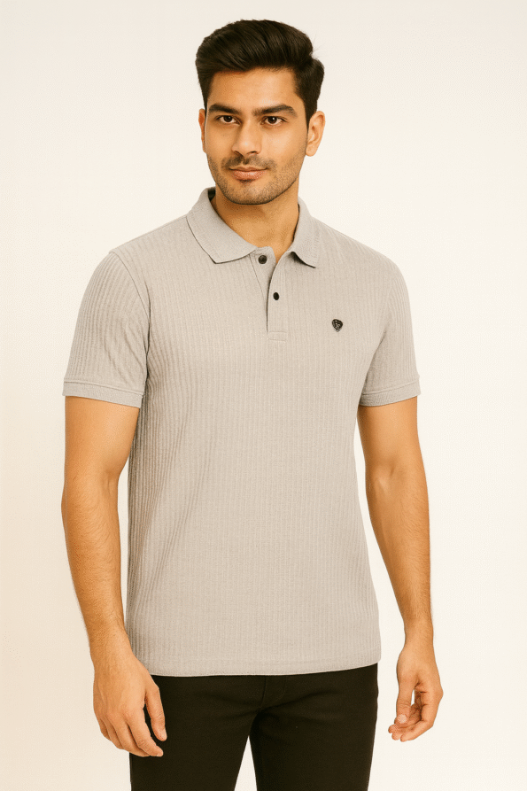 Keep your style sharp and sophisticated with this light grey textured polo t-shirt, designed for modern men who value comfort and elegance. Made from a premium cotton-blend fabric, this t-shirt offers a soft, breathable feel and excellent durability. The subtle vertical texture adds visual depth, while the embroidered chest logo provides a clean, premium finish. The polo collar and two-button placket enhance its timeless appeal, making it a versatile choice for casual and smart-casual occasions. Pair it with jeans, chinos, or shorts for an effortlessly put-together look.