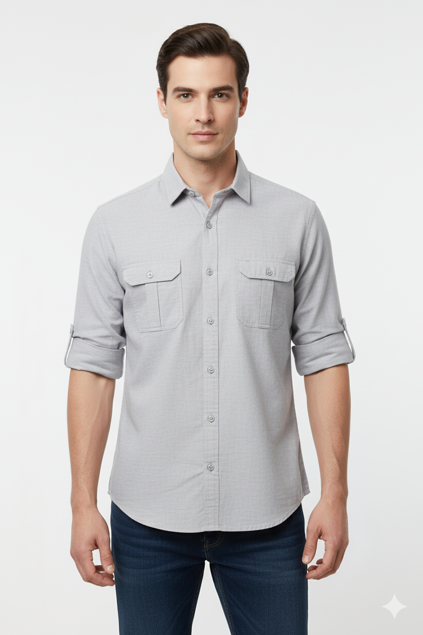 A sleek and versatile light grey cotton shirt with twin flap pockets — perfect for smart-casual and everyday wear.