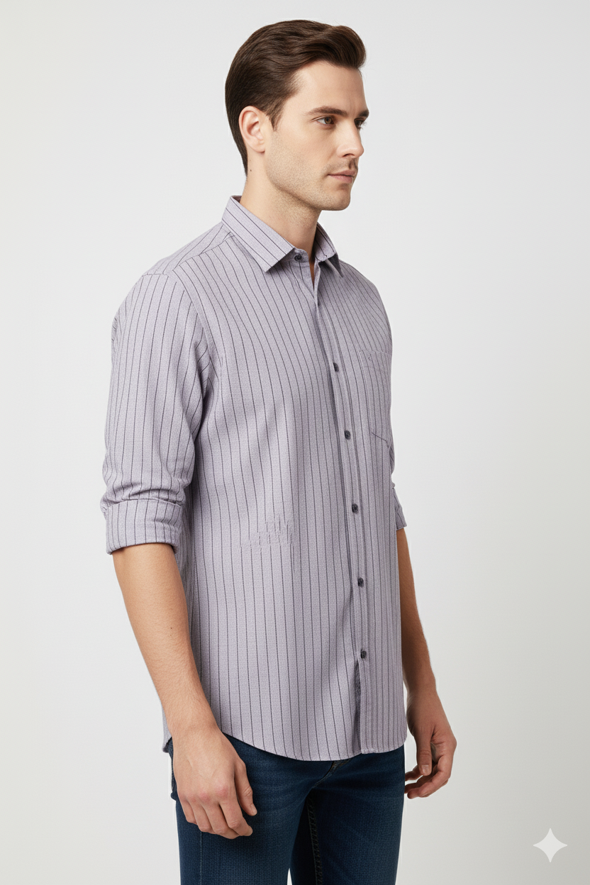 A light lavender cotton shirt with subtle vertical stripes, button-down front, and roll-up sleeves — blending comfort with a refined casual style.