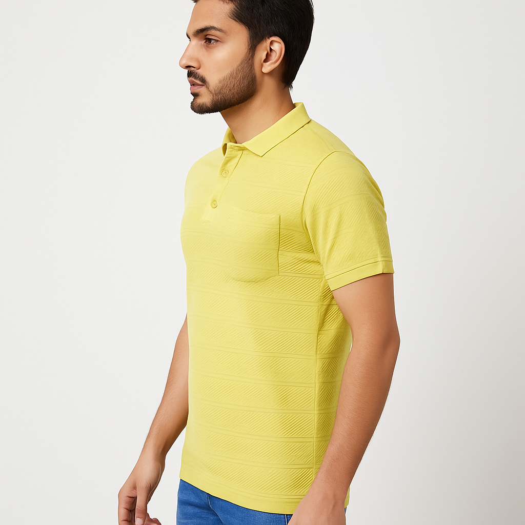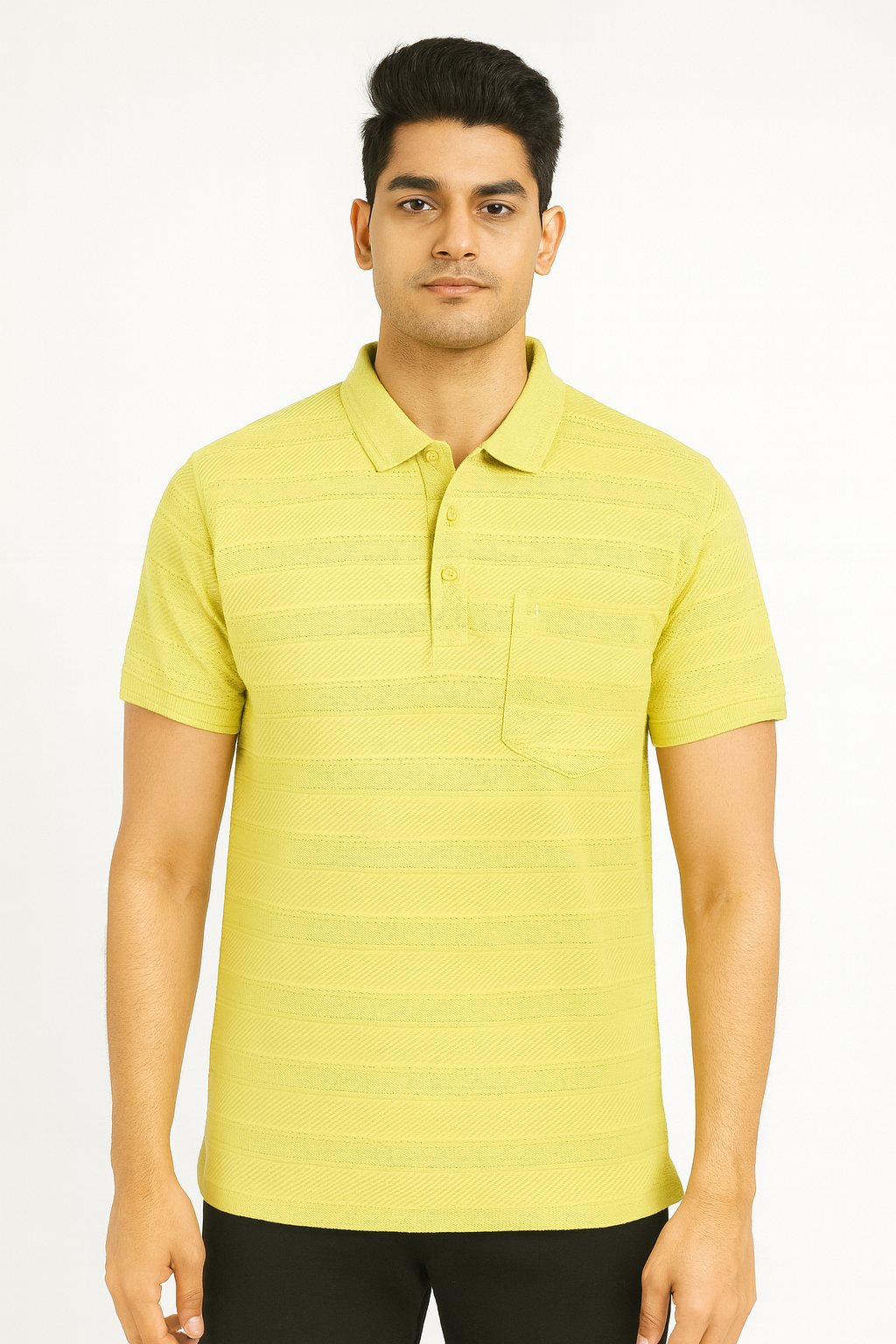 Add a vibrant touch to your wardrobe with this light lime textured polo t-shirt, crafted for men who value both comfort and modern style. Made from premium cotton-blend fabric, it ensures all-day breathability and a soft feel against the skin. The horizontal textured stripe design gives a refined look, while the classic polo collar and three-button placket maintain timeless appeal. The chest pocket detail adds functionality and a subtle design edge, making it ideal for both casual outings and semi-formal occasions. Pair it with black or navy chinos for a crisp, confident ensemble.