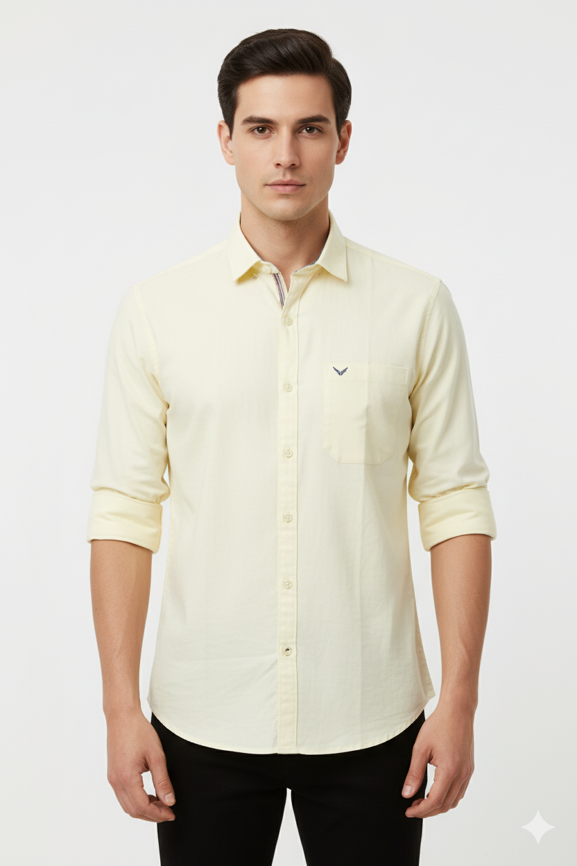 Brighten up your wardrobe with this light yellow solid casual shirt for men. Crafted from high-quality cotton fabric, it ensures breathability, comfort, and a smooth feel against the skin. The shirt features a clean button-down design, long sleeves with buttoned cuffs, and a classic collar for a polished yet relaxed appearance. The neatly stitched chest pocket adds a touch of practicality and style. Perfect for pairing with jeans or chinos, this shirt effortlessly transitions from daywear to evening gatherings, giving you a fresh and refined look.