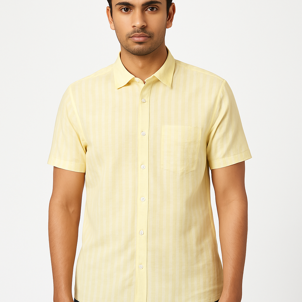 Brighten up your wardrobe with this men’s light yellow striped short-sleeve shirt. Featuring a soft pastel yellow tone with fine vertical stripes, it creates a refreshing and youthful style, perfect for summer days and casual outings. Made with breathable fabric, this shirt ensures comfort even in warm weather, while the collared neckline, button-up closure, and chest pocket add to its practicality. Pair it with white chinos for a clean look, or dark denims for a sharp contrast.