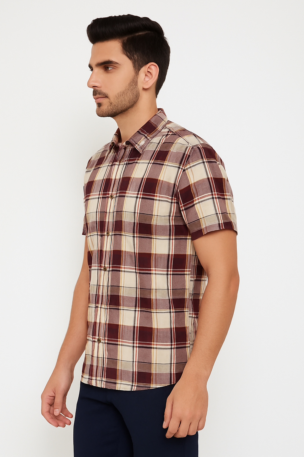 Men’s Maroon & Beige Checked Short Sleeve Shirt