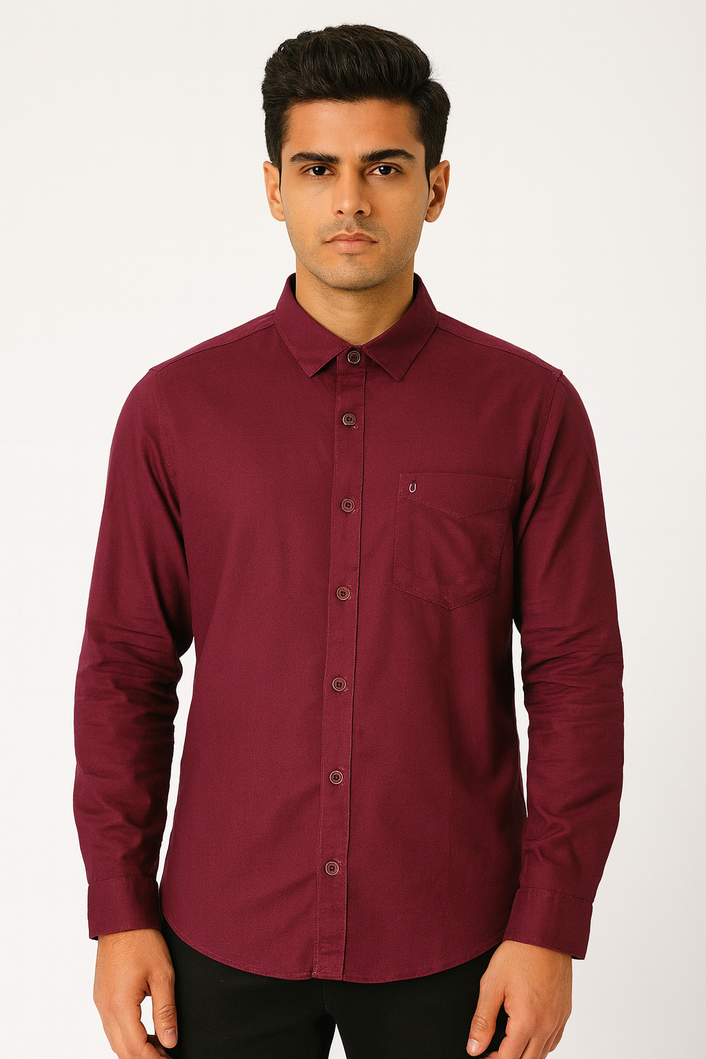 A bold maroon slim fit plain shirt, perfect for casual or semi-formal wear.