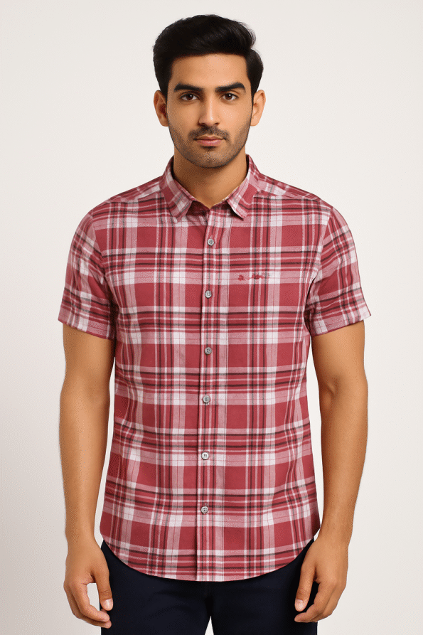 A timeless maroon and white checked shirt made from breathable cotton — perfect for casual and smart-casual looks.