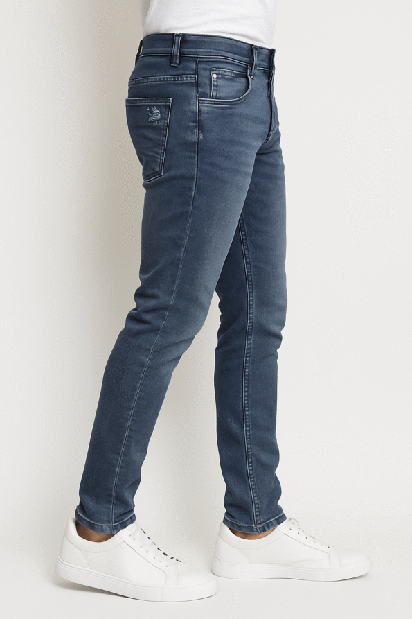 Mid-blue slim-fit stretch jeans with a washed finish, designed for style, comfort, and versatility.