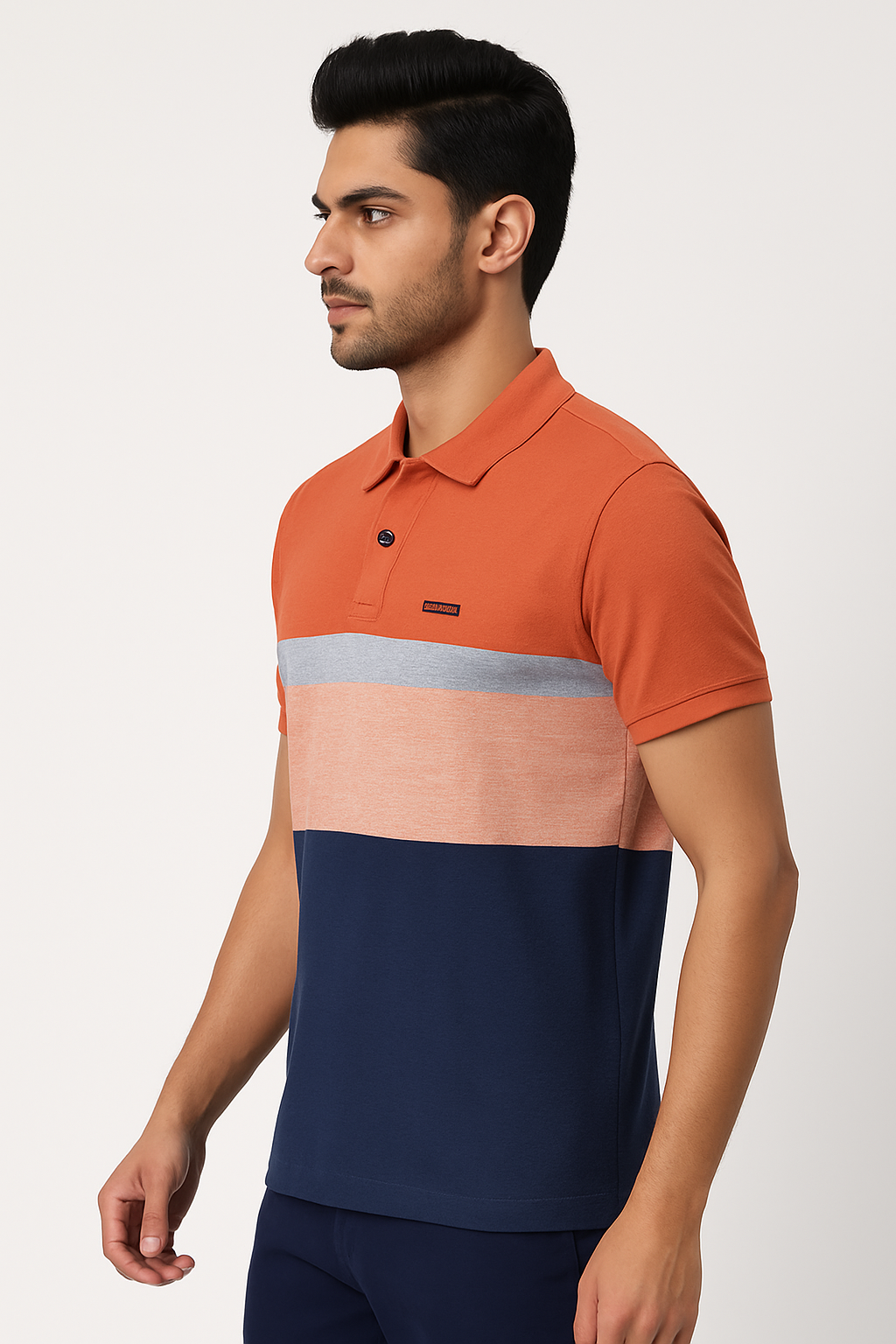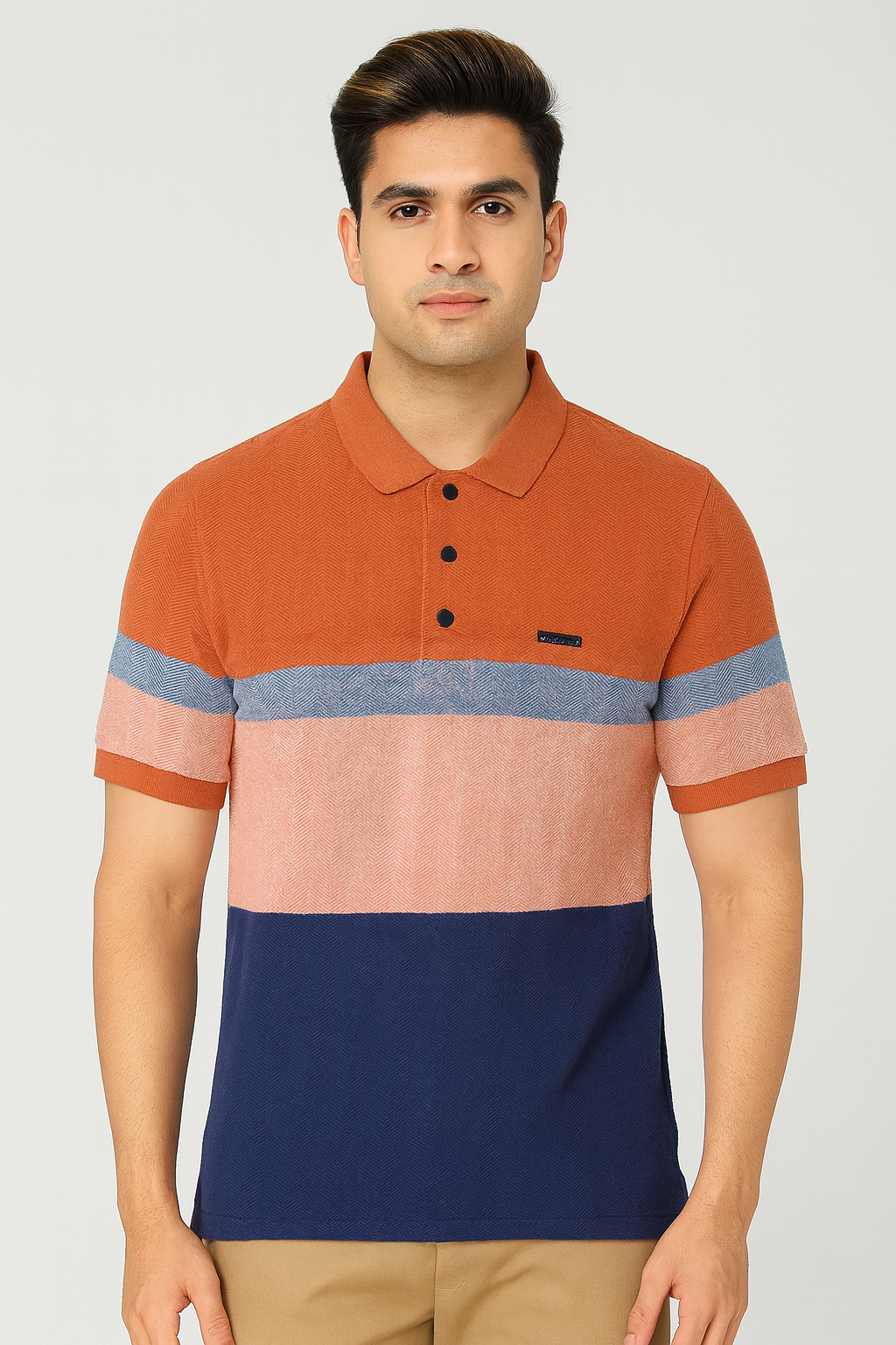 Stylish color-block polo t-shirt for men featuring rust, peach, blue, and navy stripes. Designed with a button placket, soft textured fabric, and a modern fit perfect for casual or semi-formal wear.