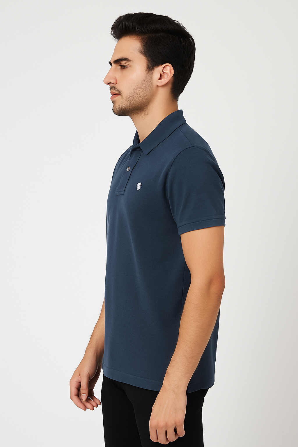 A timeless navy blue polo t-shirt featuring a classic collar, button placket, and minimal embroidered chest logo — designed for comfort, versatility, and everyday style.