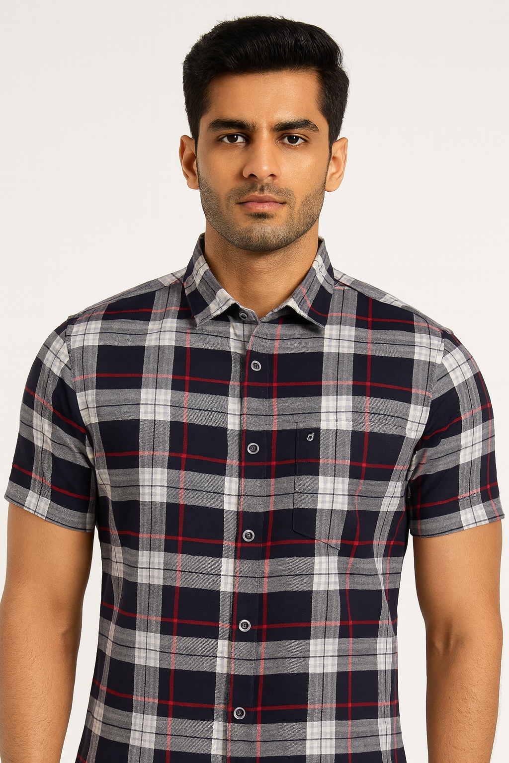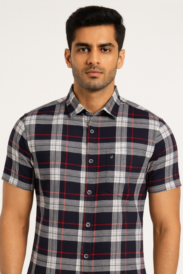 Add a touch of sophistication to your everyday wardrobe with this Men’s Navy Blue, Grey & Red Checked Cotton Casual Short Sleeve Shirt. The shirt showcases a contemporary checked pattern combining navy, grey, and red tones for a versatile and modern appeal. Tailored from premium 100% cotton fabric, it offers exceptional comfort, softness, and durability — perfect for all-day wear. Designed with a spread collar, button-down front, and a single chest pocket, this shirt strikes the perfect balance between casual charm and smart styling. Pair it effortlessly with jeans or chinos for an easy-going yet polished look.