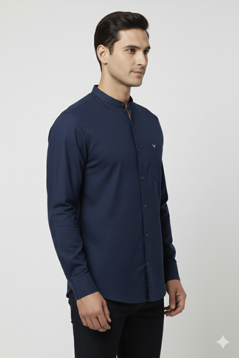 A stylish navy blue mandarin collar shirt made from soft, breathable cotton with full sleeves, a button-down front, and a sleek embroidered logo on the chest pocket. Perfect for both formal and semi-casual looks.