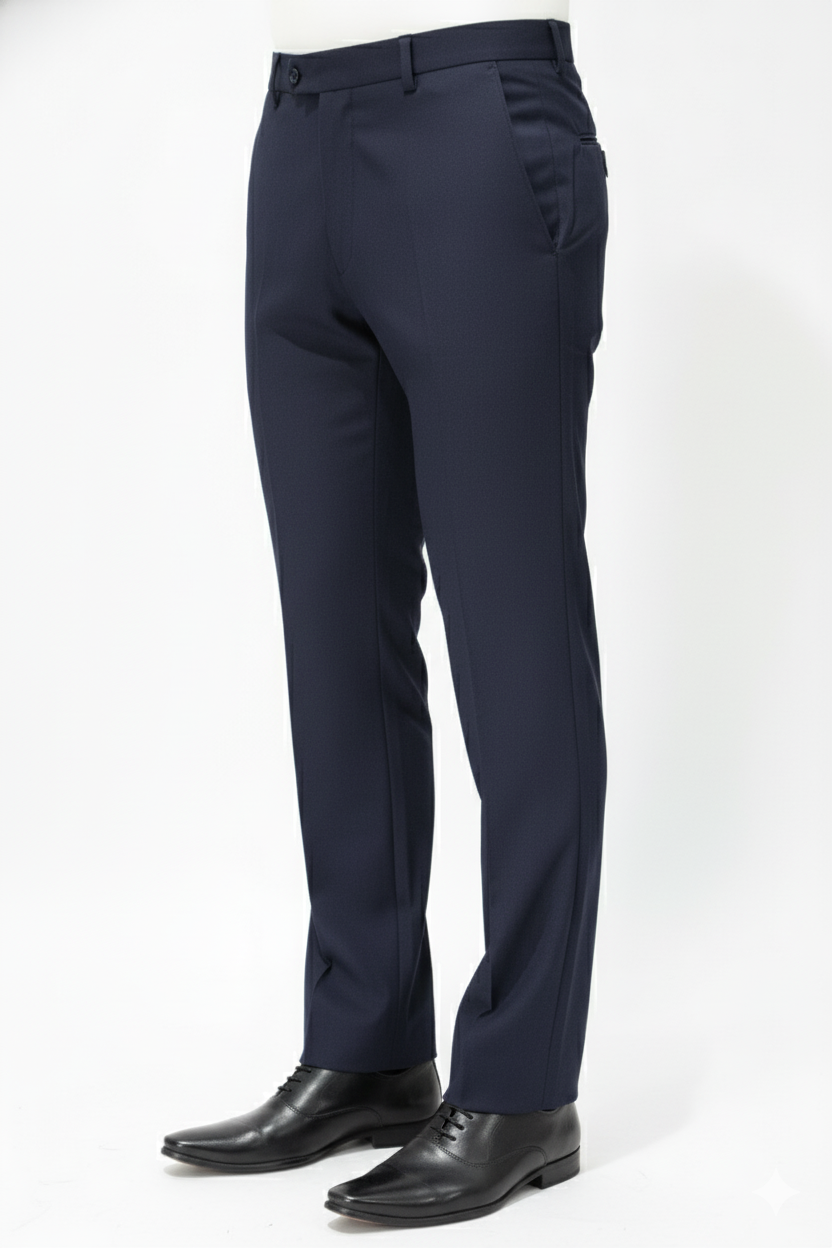 Elegant midnight blue slim-fit trousers with a subtle micro-texture — the perfect fusion of sophistication and comfort for the modern professional.