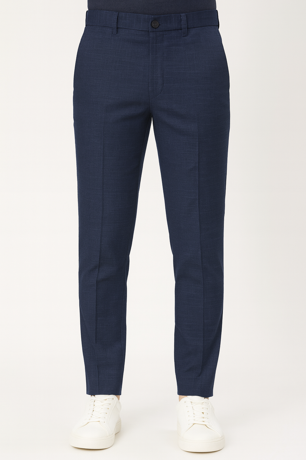 Navy blue slim-fit formal trousers with a tailored design.