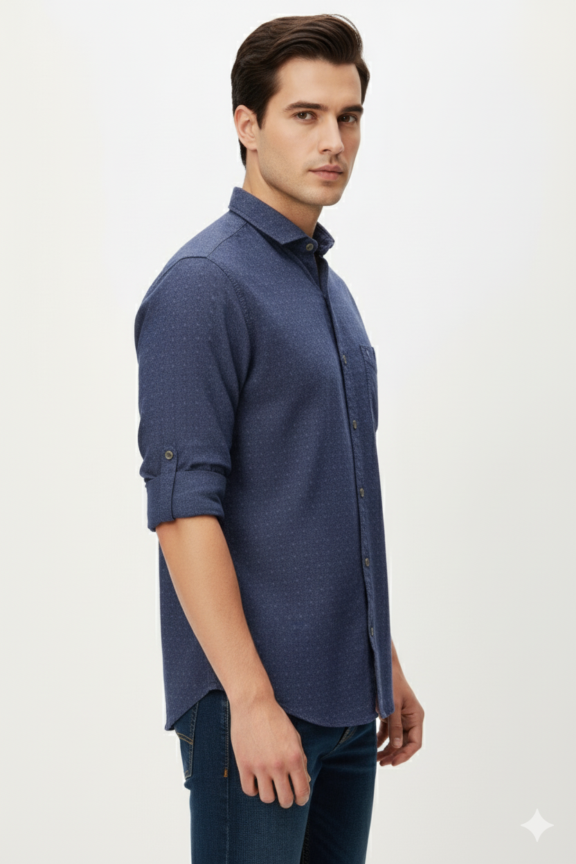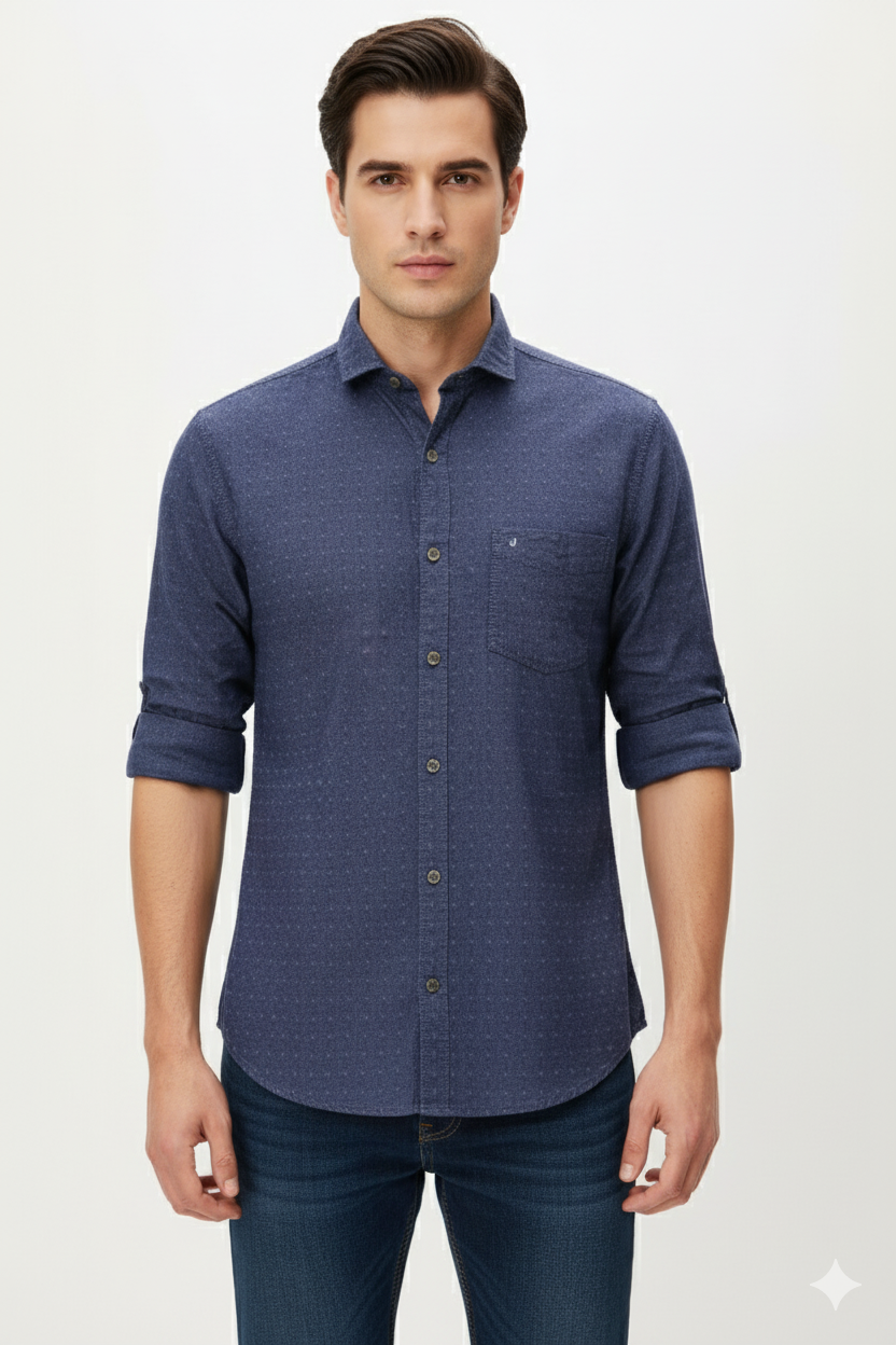 Refined navy blue slim-fit shirt with subtle textured detailing, crafted from breathable cotton for a polished and versatile look.