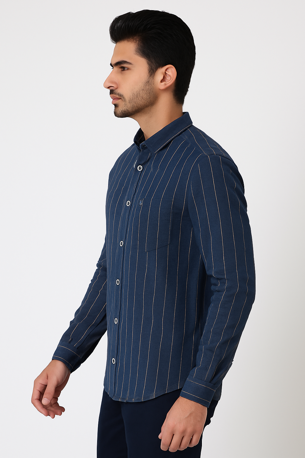 A classic navy blue shirt with elegant beige vertical stripes — designed for comfort, confidence, and timeless style.