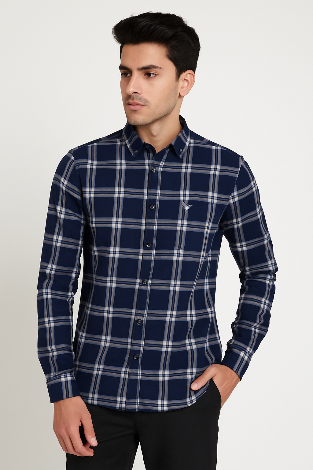 A stylish navy blue shirt with bold white checks, offering a smart and versatile look. Designed with a button-down front, chest pocket, and long sleeves, this shirt is perfect for casual outings or semi-formal settings.