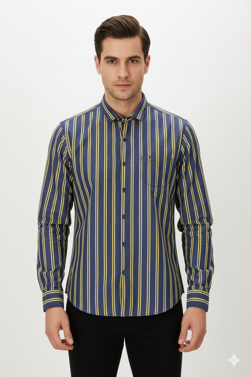 A bold navy blue cotton shirt with yellow vertical stripes — a perfect mix of classic and modern style for smart-casual looks.