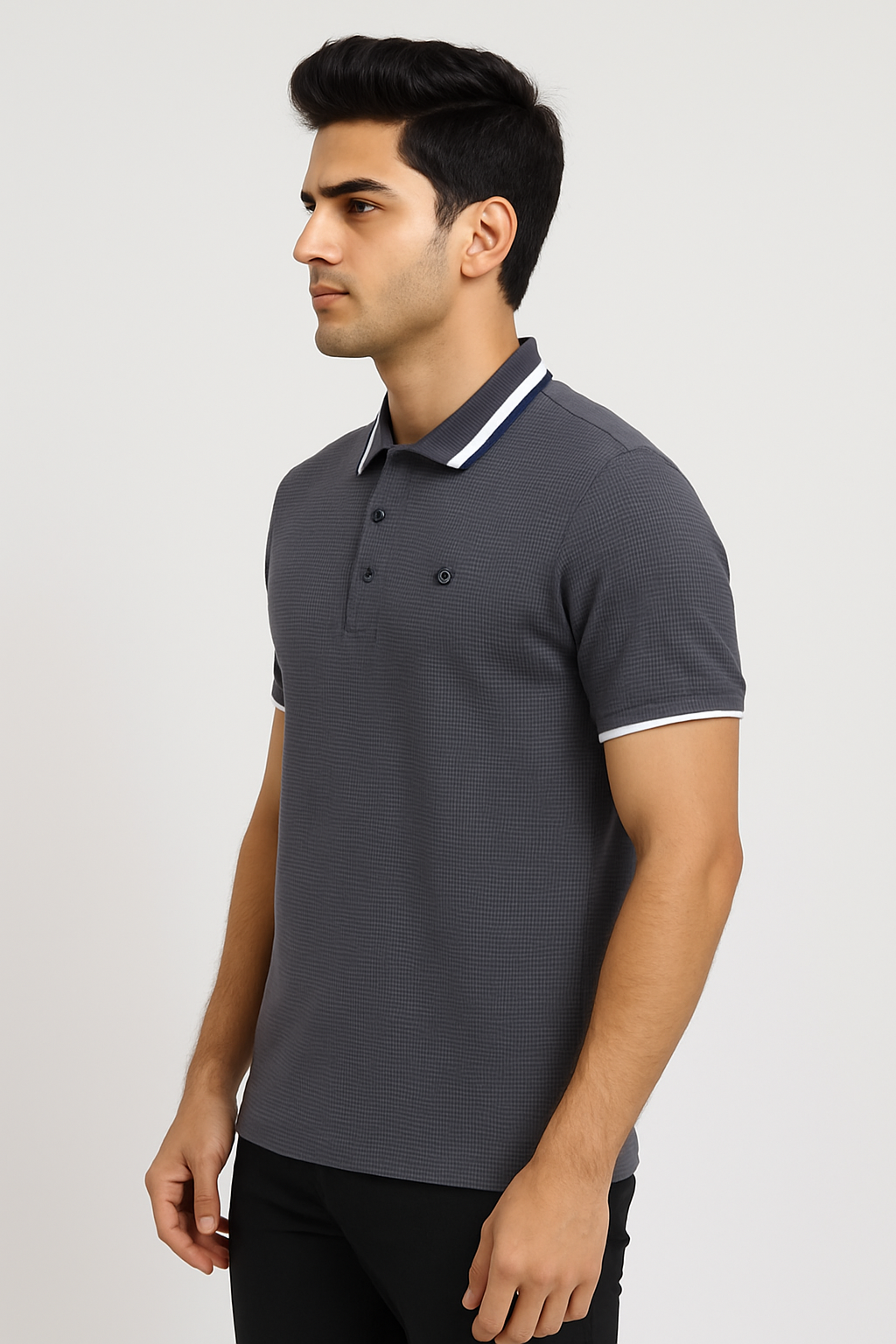 A refined navy polo t-shirt featuring a micro-textured pattern, contrast white tipping, and a sleek modern fit for everyday sophistication.