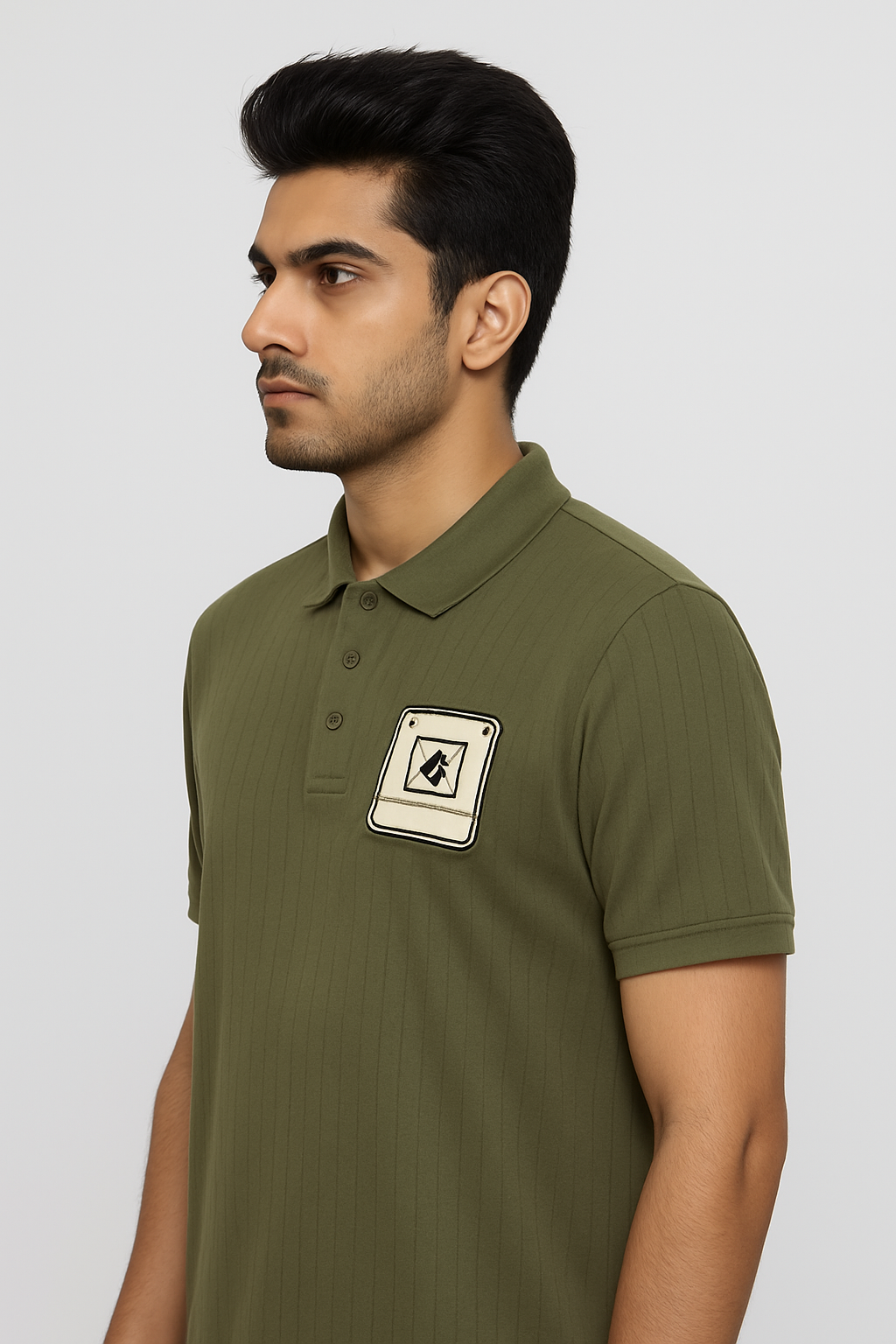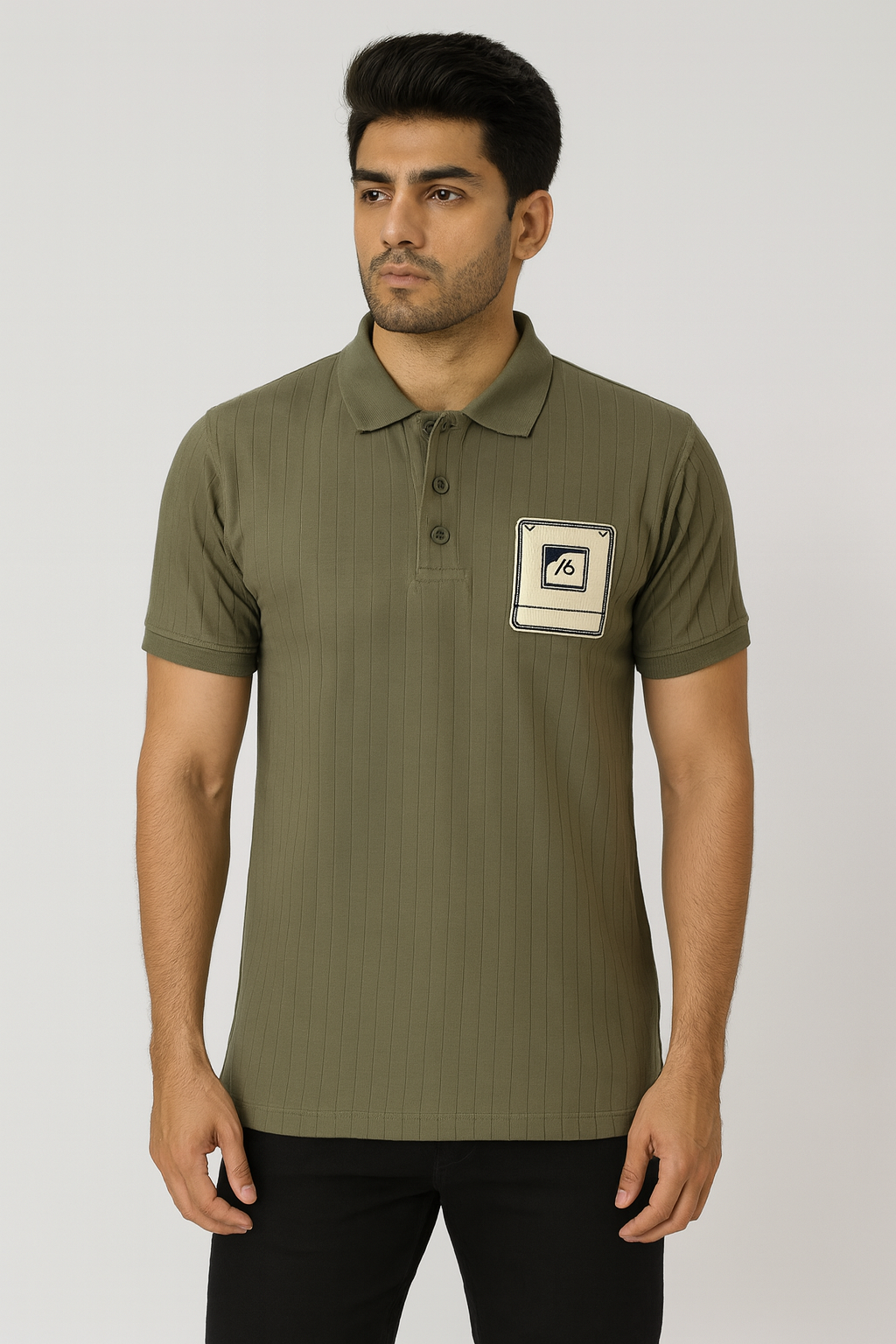 A modern olive green polo t-shirt with vertical ribbed texture and a stylish embroidered chest patch, combining comfort with casual flair.