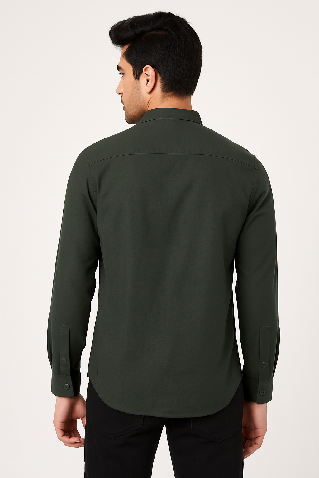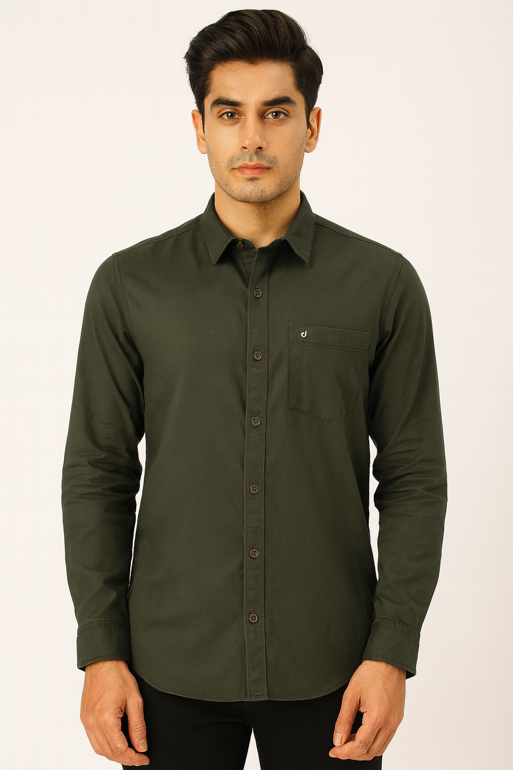 Olive green solid casual shirt—slim fit, cotton-blend comfort, with a chest pocket detail.