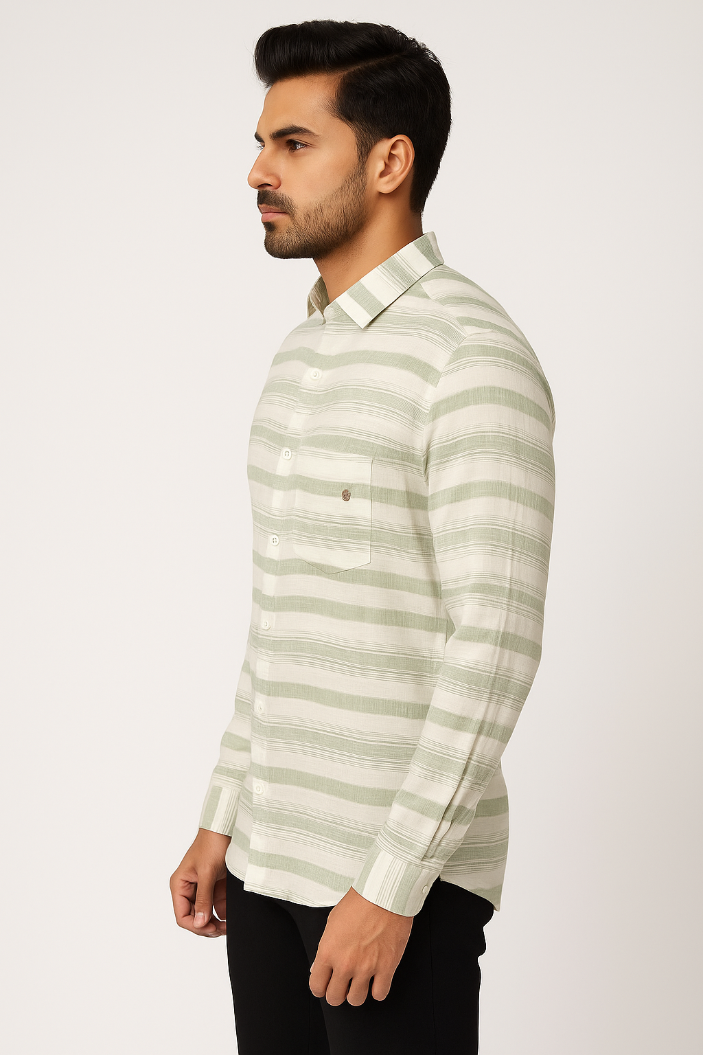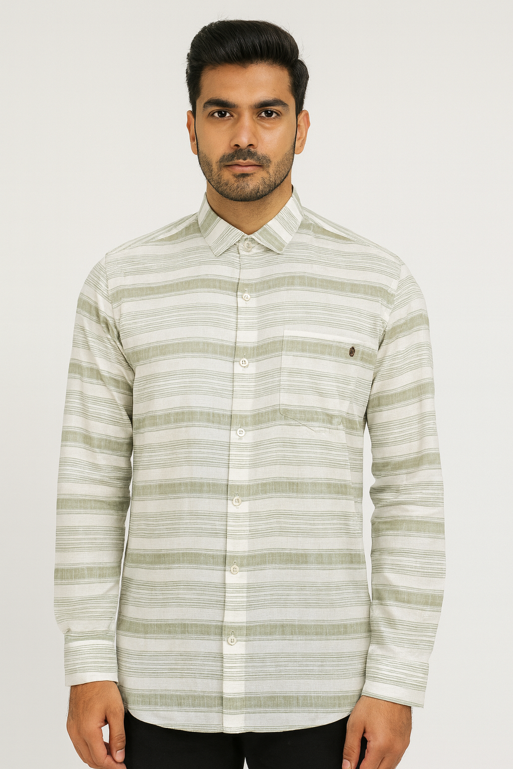A stylish olive green and white striped cotton shirt designed for everyday comfort and effortless sophistication.