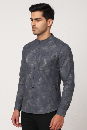 A lightweight grey short-sleeve shirt with an all-over floral motif, modern mandarin collar, full button placket, and chest pocket—ideal for statement smart-casual looks in warm weather.