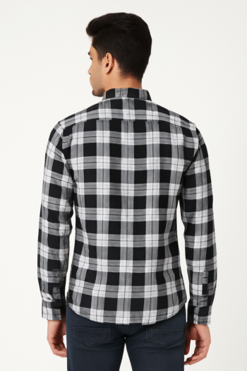 Black solid casual shirt with full sleeves and embroidered chest pocket.