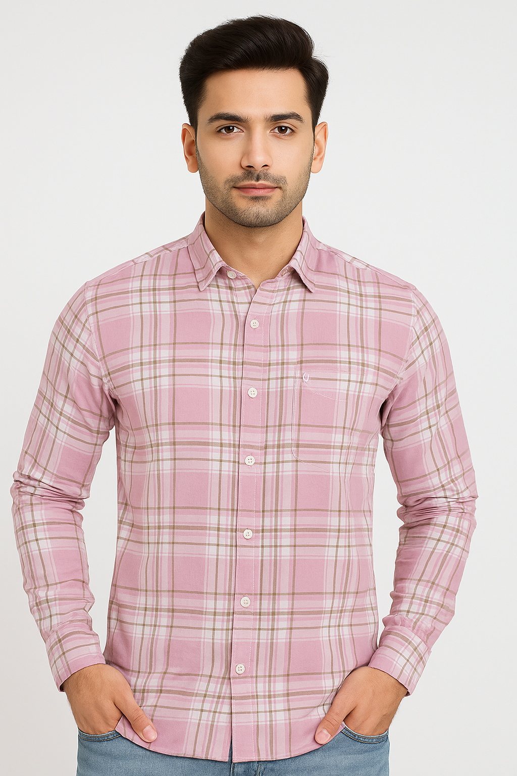 Soft pink checkered slim-fit cotton shirt with full sleeves—stylish, comfortable, and ideal for casual or semi-formal wear.