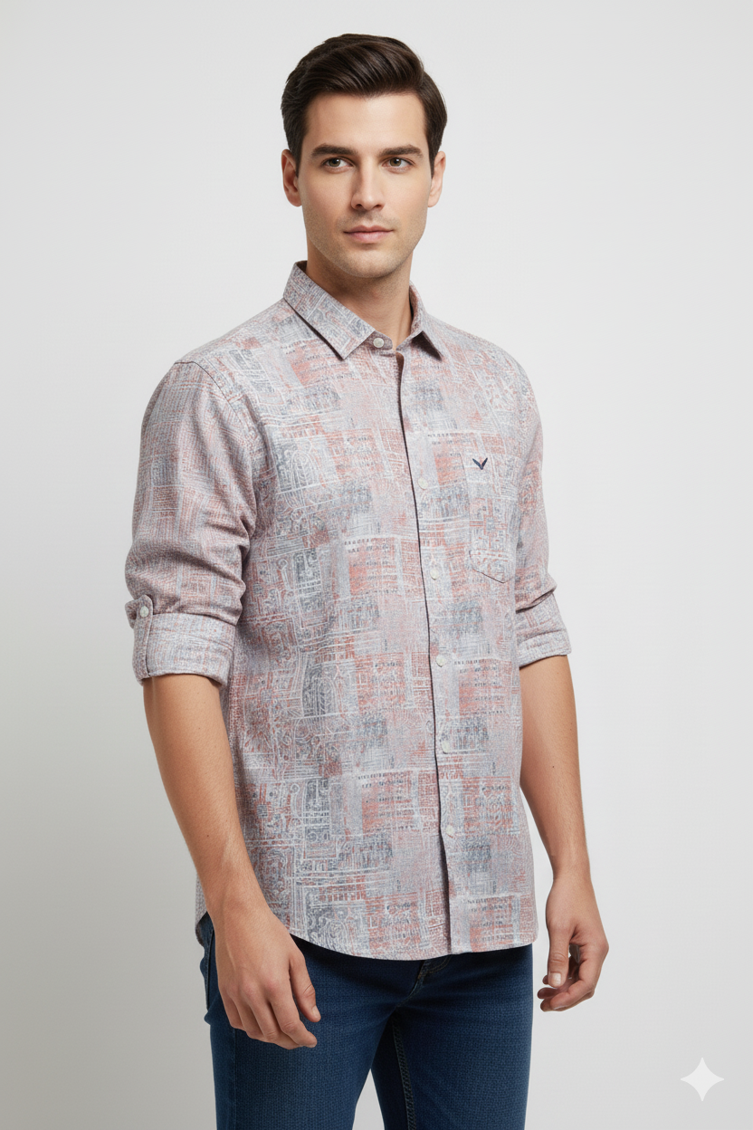 A rust and grey printed cotton shirt with a button-down front, chest pocket, and roll-up sleeves — blending urban flair with everyday comfort.