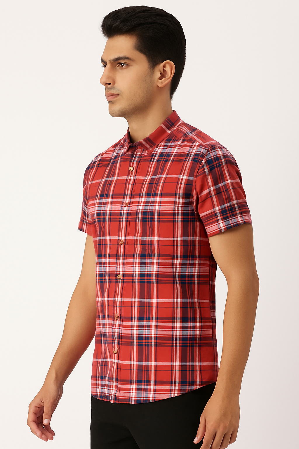 A bold red cotton shirt featuring navy blue checks — stylish, breathable, and perfect for everyday smart-casual wear.