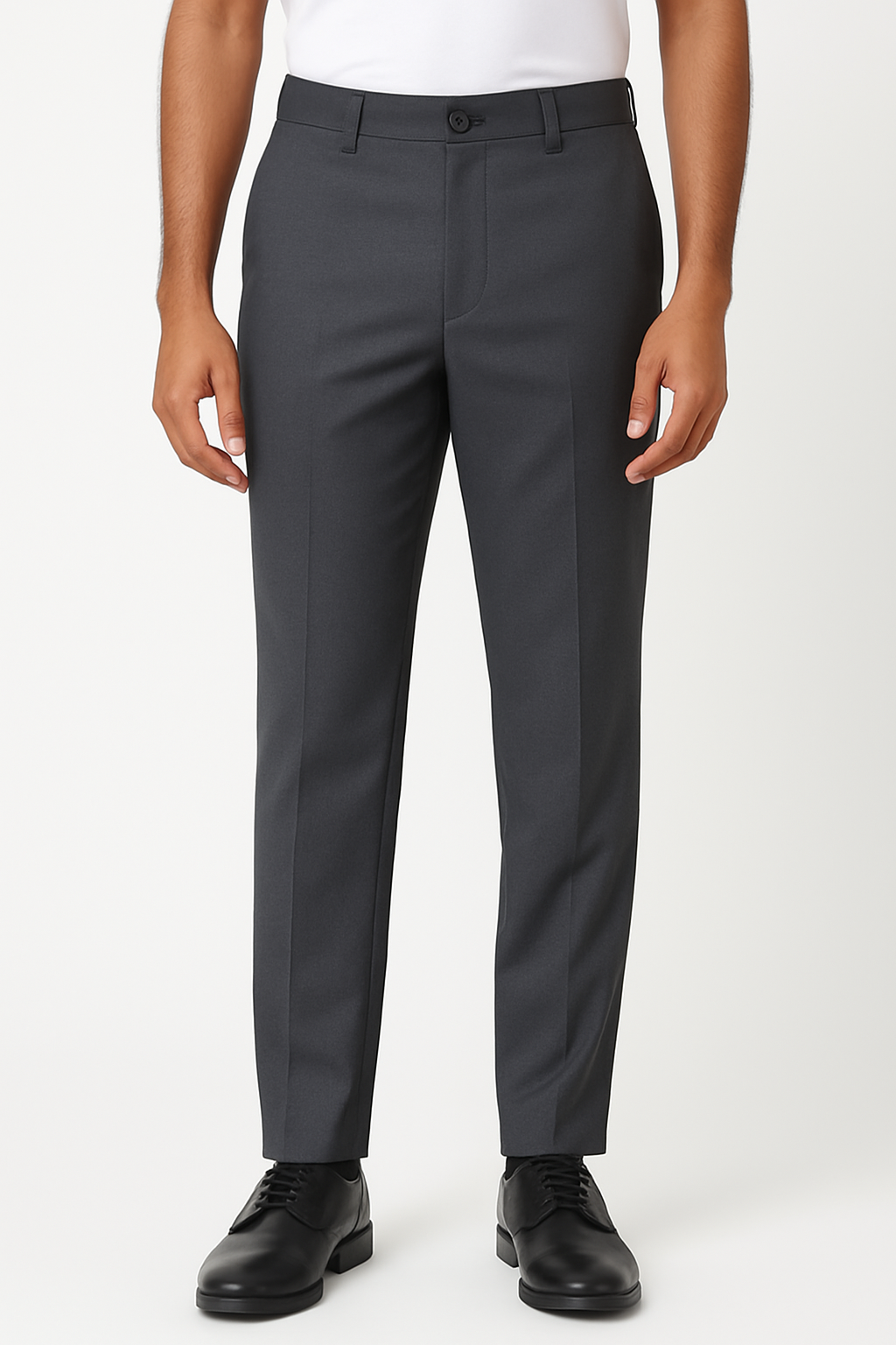 Slim-fit charcoal formal pants made from wrinkle-resistant fabric, featuring a flat front, button closure, and crisp crease lines—perfect for work and formal occasions.