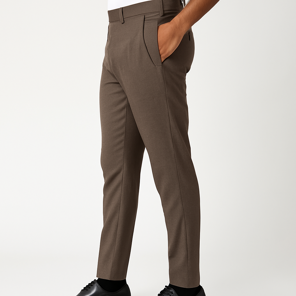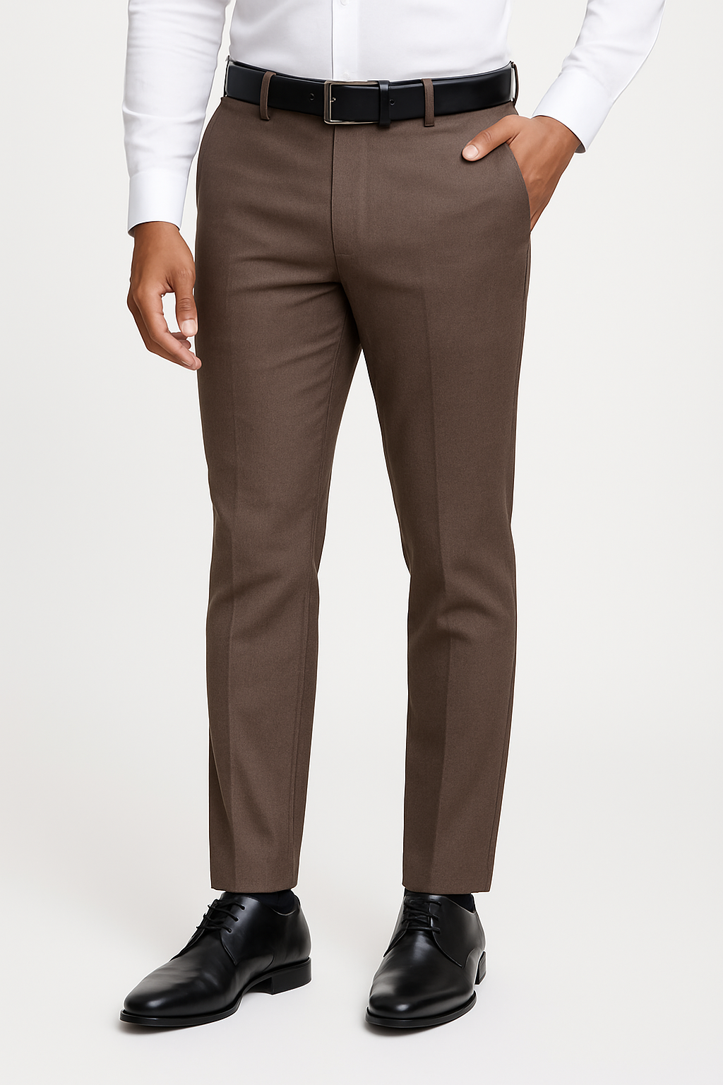 Sophisticated slim-fit coffee brown trousers featuring a clean flat-front design, crisp crease lines, and premium fabric—perfect for office wear and formal occasions.