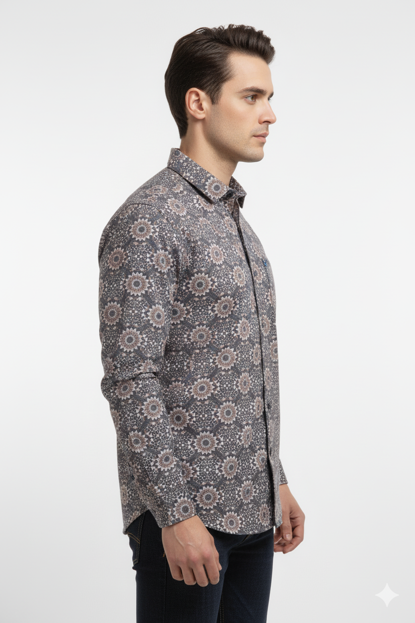 Elevate your wardrobe with this Men’s Slim Fit Printed Cotton Shirt, featuring an eye-catching floral mosaic pattern in earthy tones. Designed for the modern man, this shirt combines comfort and sophistication with its soft, breathable cotton fabric and tailored slim fit. Perfect for both casual outings and semi-formal occasions, it pairs effortlessly with jeans or chinos. The full-sleeve design and button-down collar add a touch of refinement, making it a versatile choice for any season.