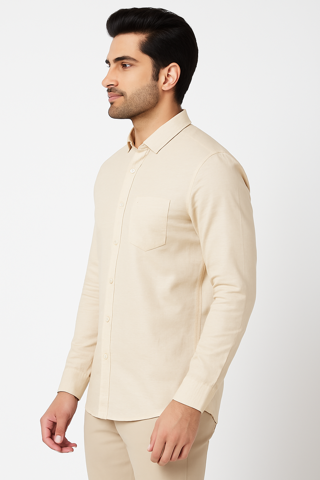 A classic beige casual shirt made from a soft cotton-blend fabric. Designed with full sleeves, a classic collar, and a front pocket, this shirt is versatile for both work and casual outings, offering comfort and style.