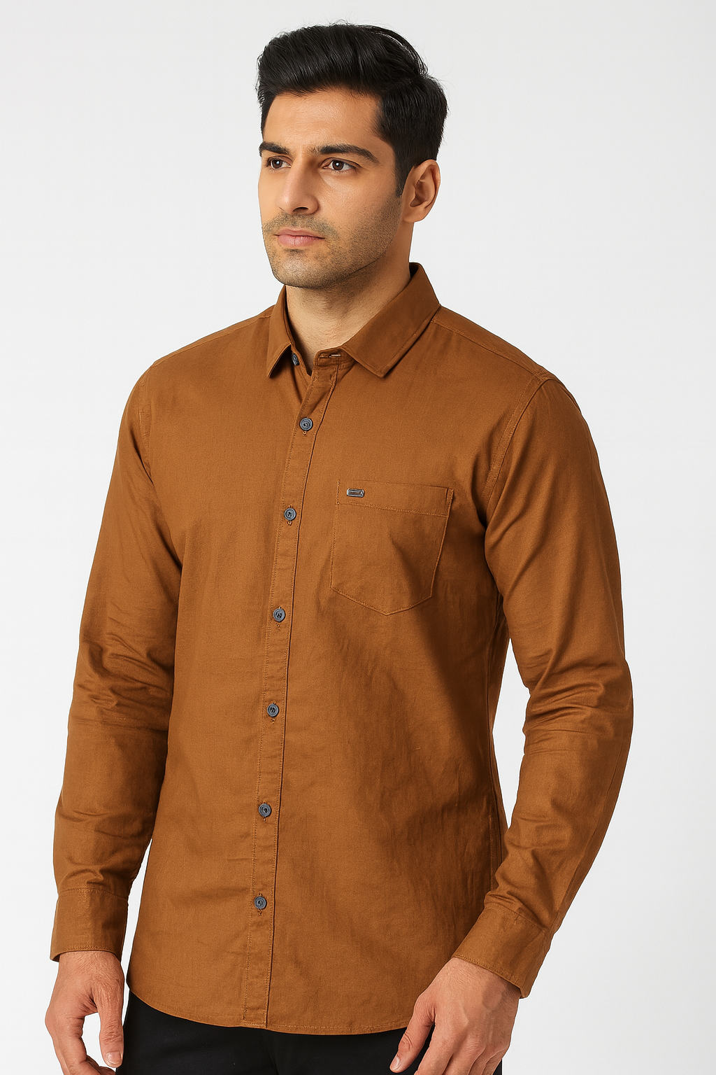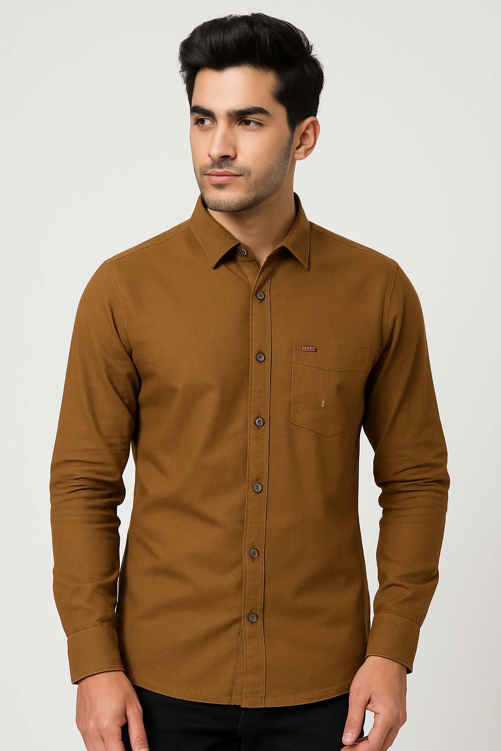 A rich brown solid casual shirt designed for timeless style and versatility. Featuring a button-down front, full sleeves, and a chest pocket with a subtle brand tag, this shirt is perfect for both office wear and casual outings. The earthy tone adds a bold yet classy edge to any wardrobe
