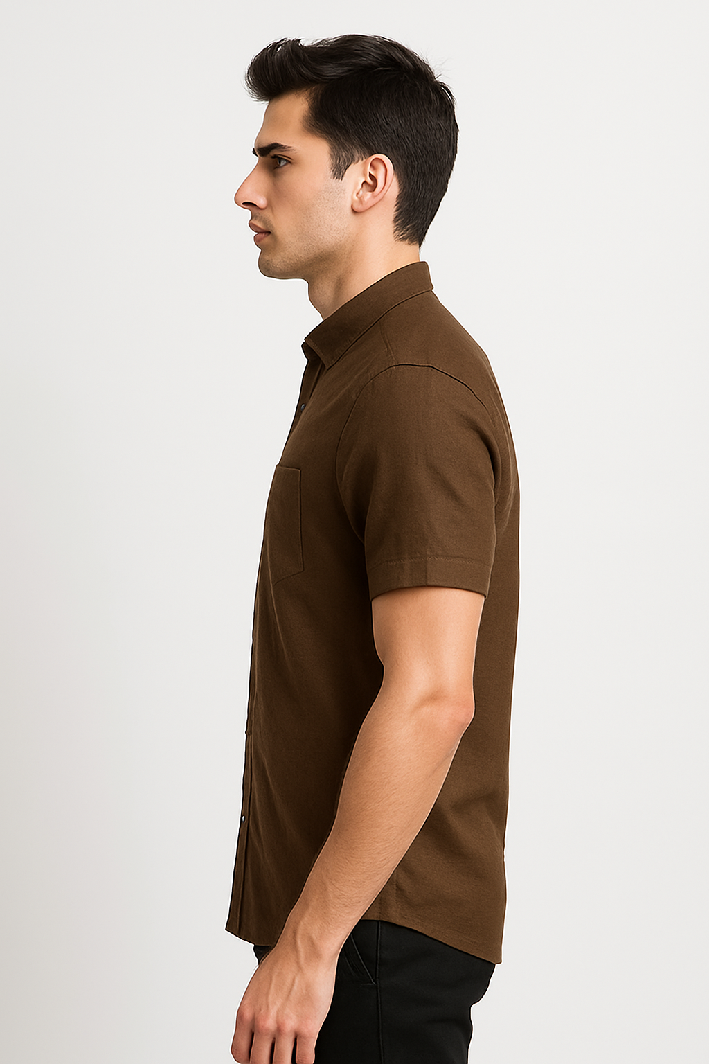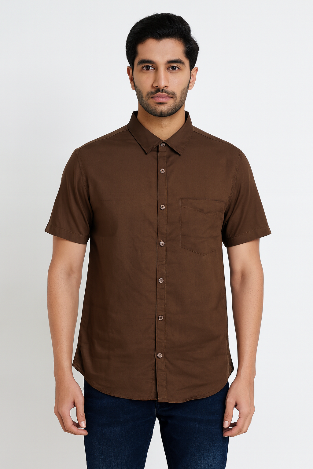 Elevate your everyday style with this men’s solid brown short sleeve shirt. Crafted from soft, breathable fabric, it offers all-day comfort while keeping you effortlessly stylish. Featuring a classic collar, a chest pocket, and a button-down front, this shirt strikes the perfect balance between smart and casual. Pair it with jeans or chinos for versatile looks suited to both work and weekend outings.