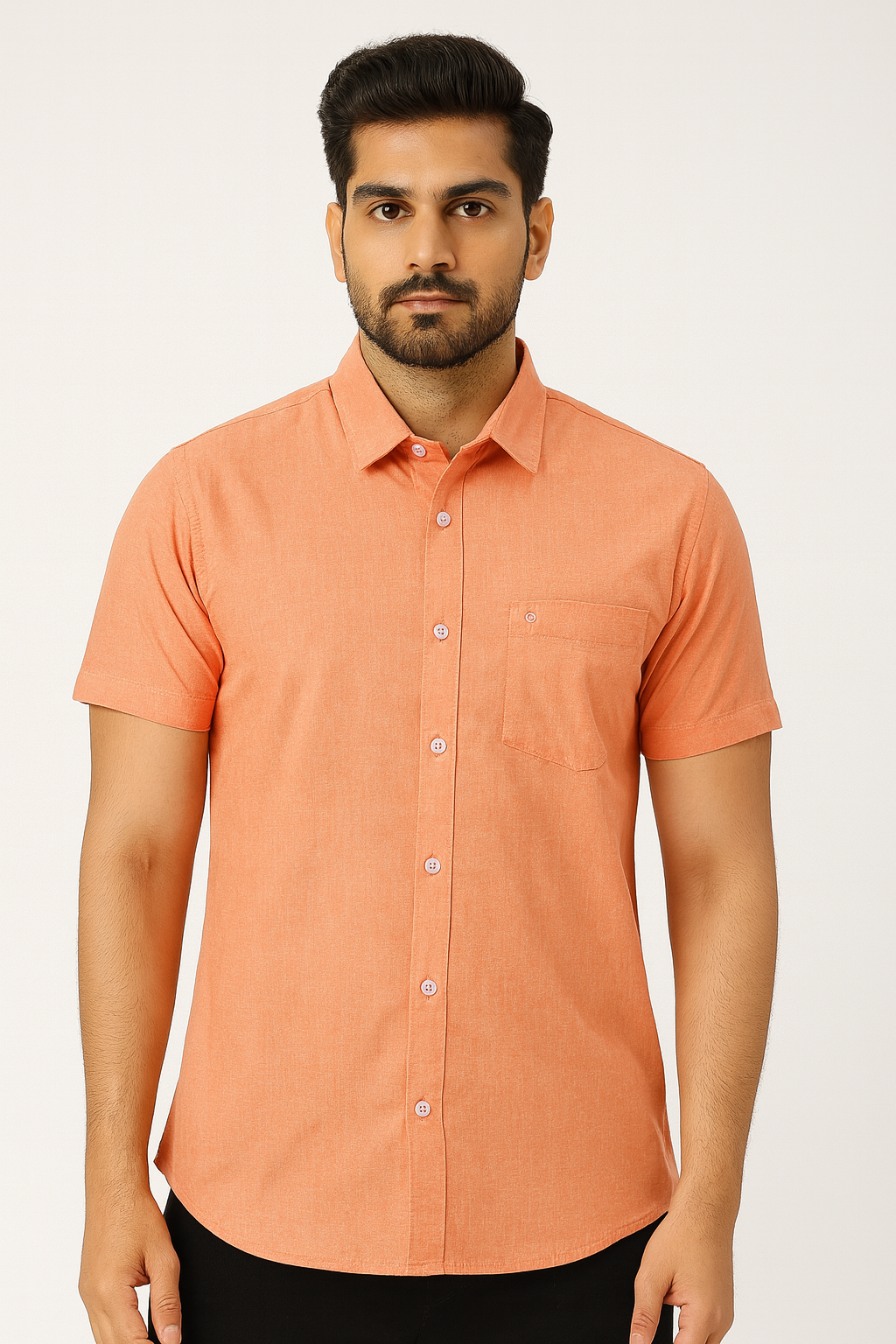 A vibrant solid orange short-sleeve shirt made from soft, breathable cotton. Perfect for adding a fresh, confident look to your casual wardrobe.