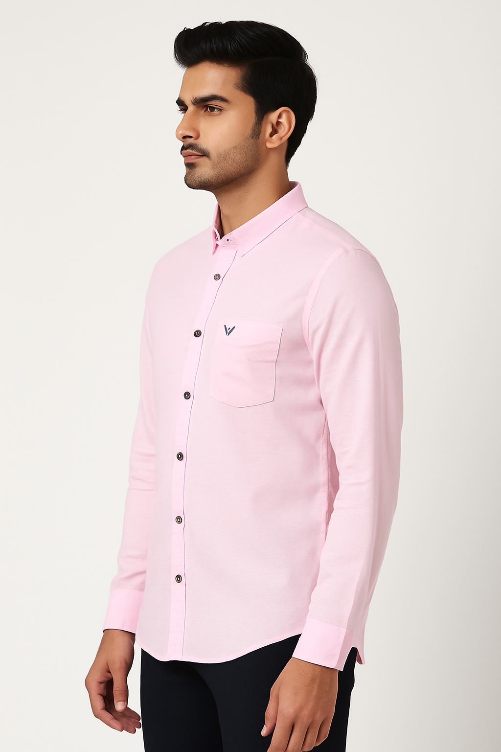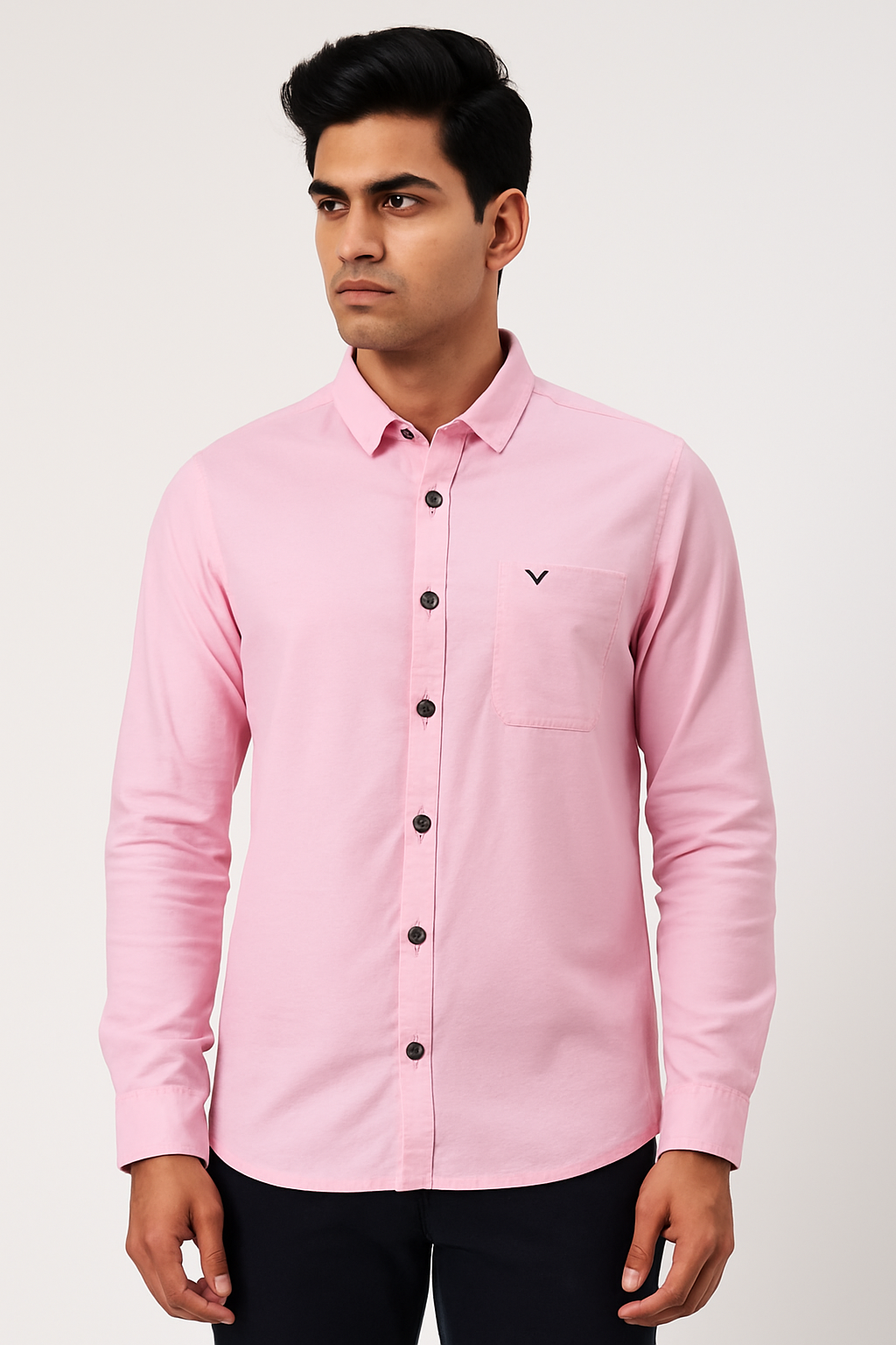 A stylish solid pink slim-fit shirt featuring a clean button-down design, chest pocket, and soft cotton-blend fabric—perfect for both casual and semi-formal occasions.